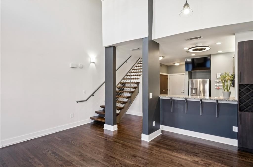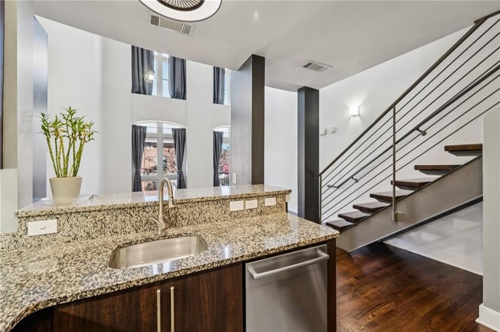 Stylish City living at Caroline Street Lofts in Edgewood Shopping district! The great room boasts soaring 2 story ceilings and is beaming with tons of natural light from the 2 story wall of windows. The loft bedroom has a second floor view of the great room and is also bathed in natural light. Located in the second building off Moreland, you'll enjoy quieter time at home. You'll love the sky views from the northern facing windows. The Kitchen comes equipped with granite counters, new s/s appliances, and breakfast bar. Gleaming hardwood floors throughout have just been refinished. Walk up the impressive floating stairs to the large loft master with walk in closet. Spacious bath includes separate shower and tub. The assigned parking space is conveniently located just two spaces from the entrance door. There is also a storage unit down the hall - with ample space for seasonal items. Caroline Street Lofts are part of the Edgewood Retail District with multiple shops and restaurants, including Kroger, Target, Lowes, Best Buy, TJ Maxx, Five Guys, Wily's and more - SO convenient! The location is walkable to neighborhood districts including Inman Park, Candler Park, and Little 5 Points. AND! Inman Park MARTA station is a short 10 minute walk! Convenient to Airport/I-20 as well!
