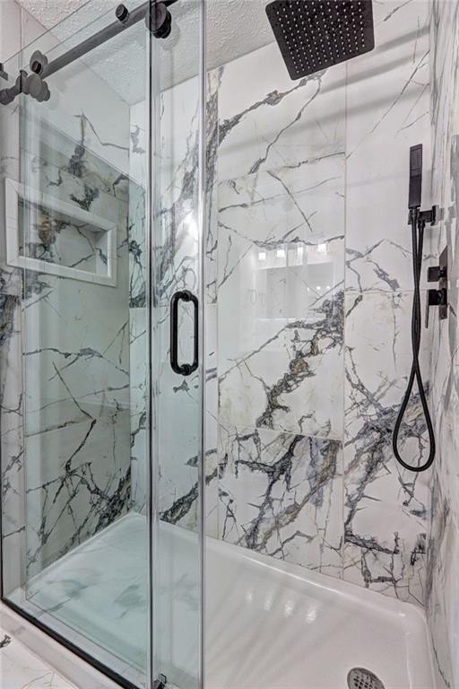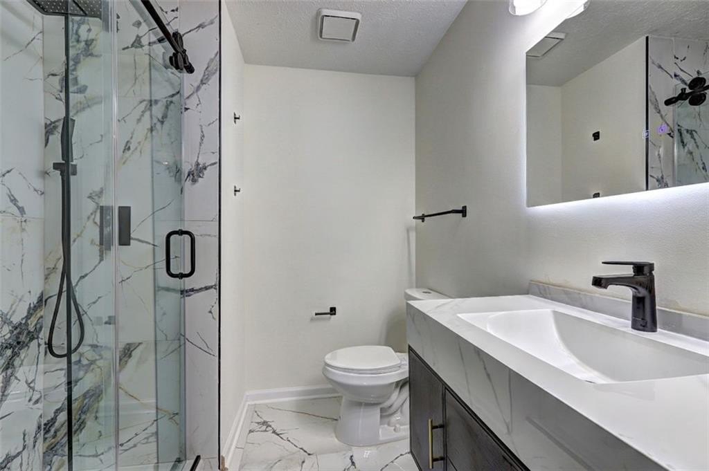 Retreat to the luxurious master suite, complete with a spa-like en-suite bathroom, floating sinks, and an exquisite glass-enclosed rainfall shower. The sleek, modern finishes and marble-inspired tilework add a touch of sophistication.
