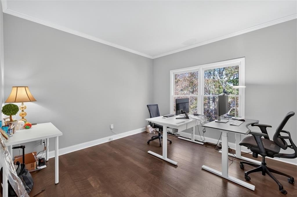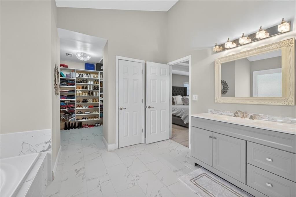 Upstairs, the owner’s suite impresses with a bright sitting area, beautifully updated spa-style bathroom, and a custom walk-in closet with built-in cabinetry. Secondary bedrooms are spacious and share another full bath.
