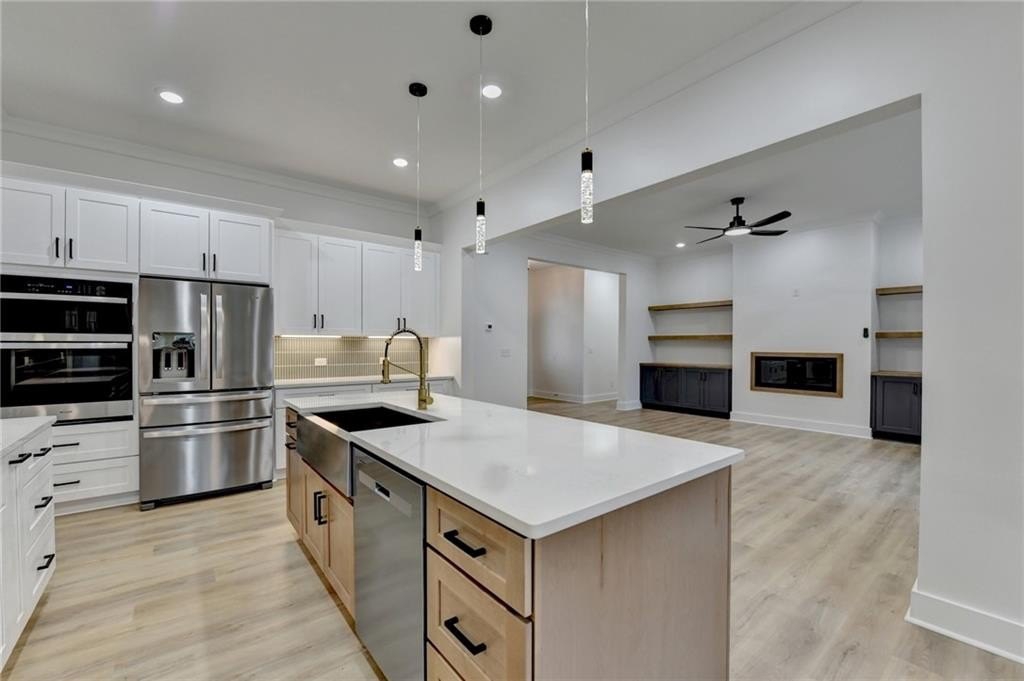 The main level welcomes you with an open-concept living area filled with natural light and high ceilings. At the heart of the home is the beautifully crafted kitchen, featuring an oversized island, a large walk-in pantry, and a double oven—where the upper oven also functions as a microwave, giving you incredible cooking flexibility. Stylish finishes and high-quality cabinetry give the kitchen an elevated feel.