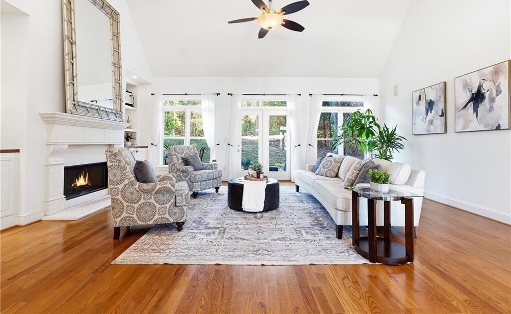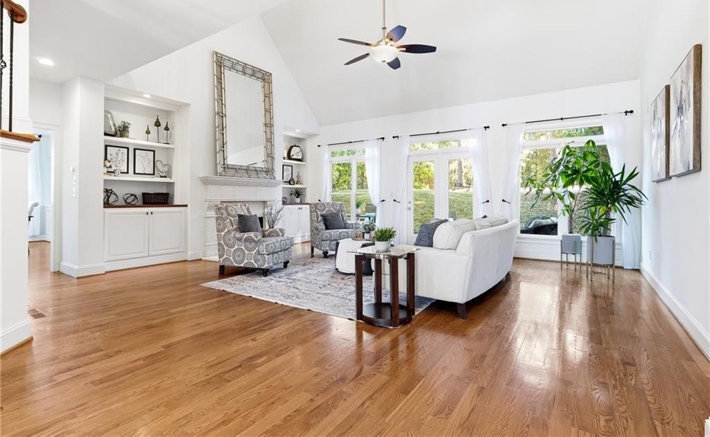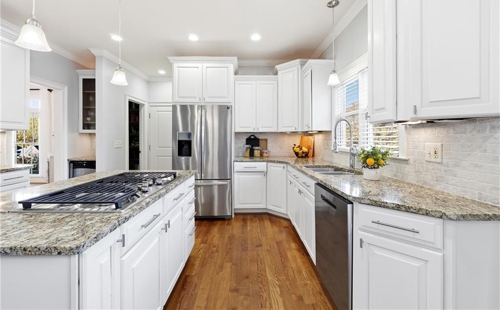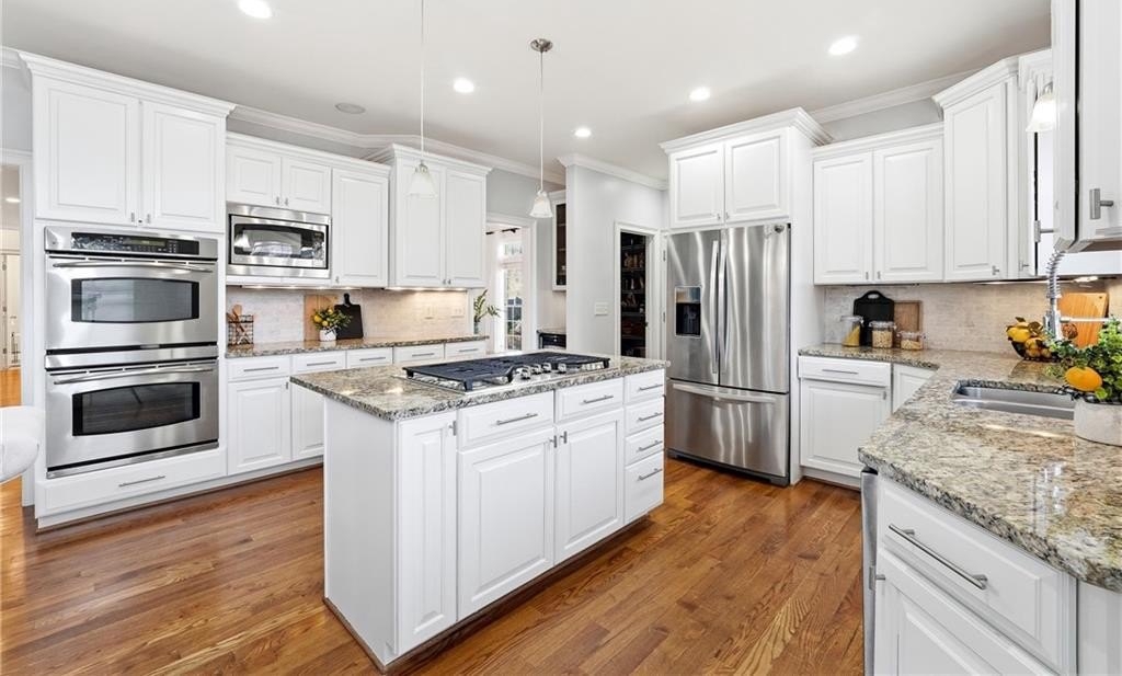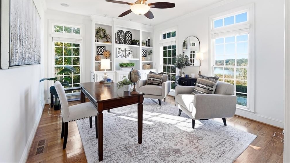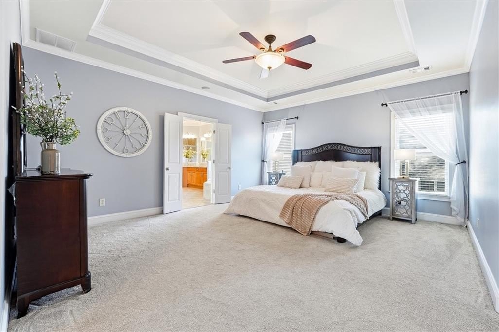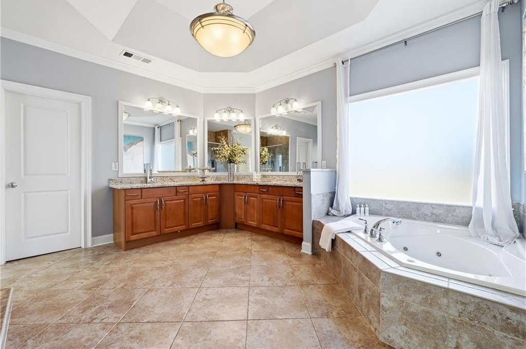Experience luxury living at its finest with this stunning turn-key builder’s custom home, boasting golf course and lake views that set a remarkable backdrop for every day. The elegant family room soars with a vaulted ceiling and opens to a expansive rear patio complete with an outdoor kitchen, ideal for seamless entertaining. A chef’s dream kitchen features abundant cabinetry overlooking the breakfast area and keeping room, while a dedicated study, formal dining, and a guest room with private bath on the main level offer versatile living spaces. Upstairs, the master suite indulges with a sitting area and fireplace that overlook the tranquil lake, accompanying a lavish spa bath with heated tile floors, dual shower heads, a soaking tub, and generously sized his-and-hers closets. The finished basement presents a media area, gym, a bedroom with private bath, storage, and a quintessential craftsman’s workshop with convenient garage access and a wash tub. A three-car garage provides walk-up storage space for added convenience. This residence also features a nearly new roof (installed two years ago) with new gutters, refreshed basement flooring and stairs, a redesigned master bathroom countertop, a new main AC unit, and new water heaters, delivering exceptional comfort and reliability throughout.