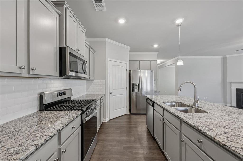 Dual Wall Ovens, Oversized Island, Granite Countertops, Pendant Lighting, Pantry, Breakfast Bar and View to Family Room.