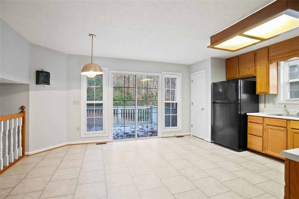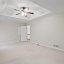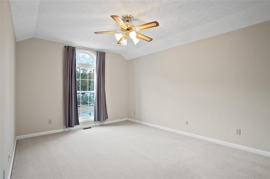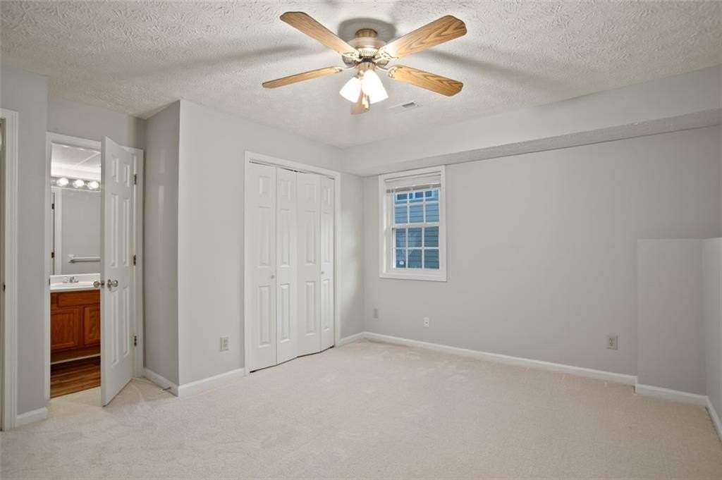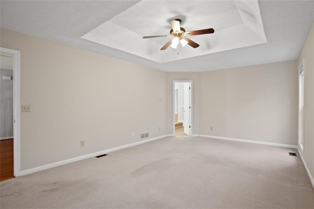 The large eat-in kitchen features black appliances, abundant cabinetry, and access to a private deck. Overlooking the kitchen is a massive bonus room complete with a corner wet bar—perfect for entertaining. On the upper level, a loft with a built-in bookcase offers a lovely view of the dining and great rooms. The primary suite includes a tray ceiling, room for a sitting area, and a luxurious bath with a soaking tub, separate shower, and an oversized walk-in closet. Two additional bedrooms provide generous closet space and plenty of natural light through large windows.