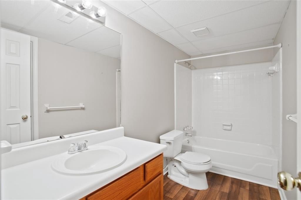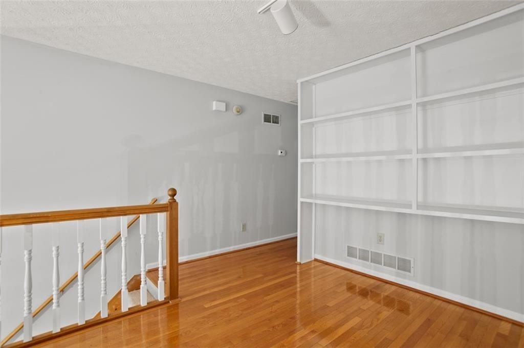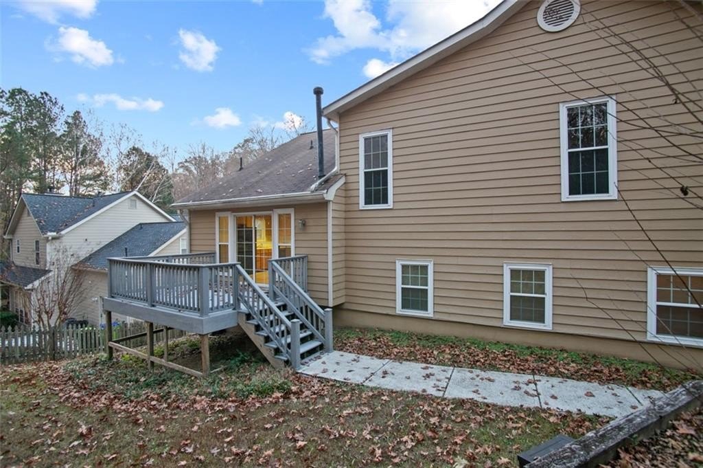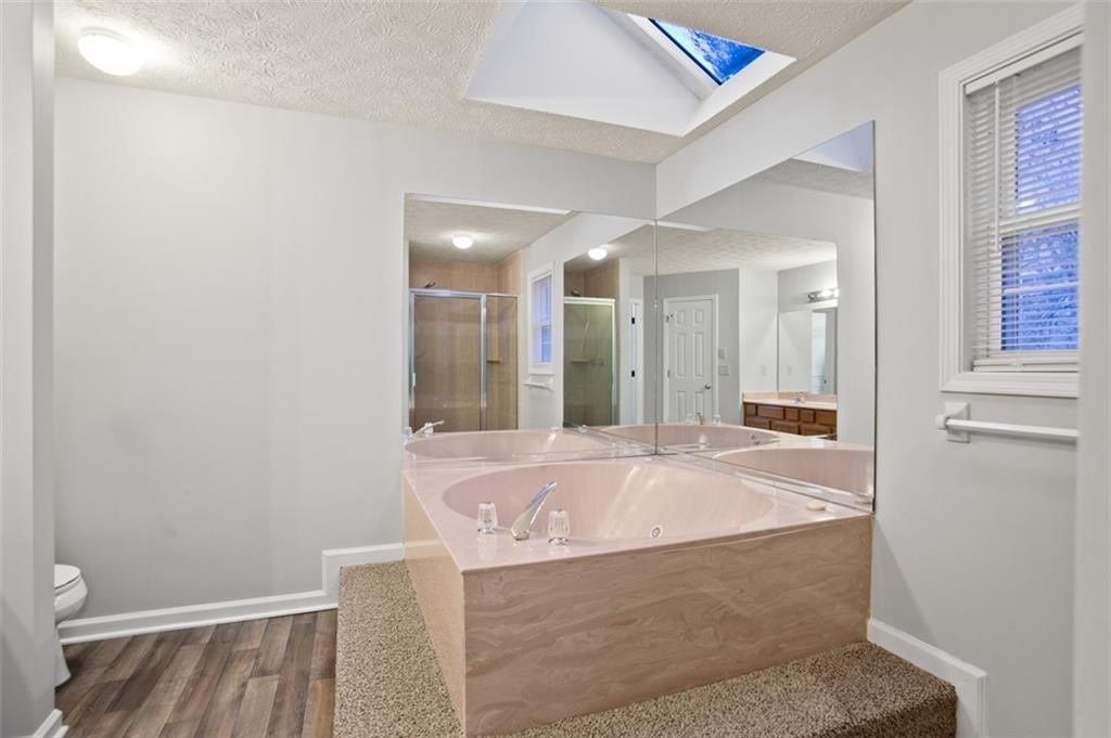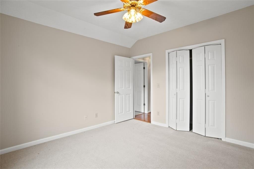 The large eat-in kitchen features black appliances, abundant cabinetry, and access to a private deck. Overlooking the kitchen is a massive bonus room complete with a corner wet bar—perfect for entertaining. On the upper level, a loft with a built-in bookcase offers a lovely view of the dining and great rooms. The primary suite includes a tray ceiling, room for a sitting area, and a luxurious bath with a soaking tub, separate shower, and an oversized walk-in closet. Two additional bedrooms provide generous closet space and plenty of natural light through large windows.