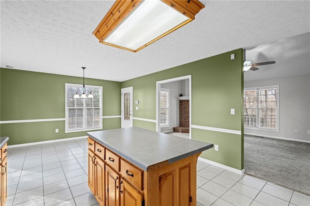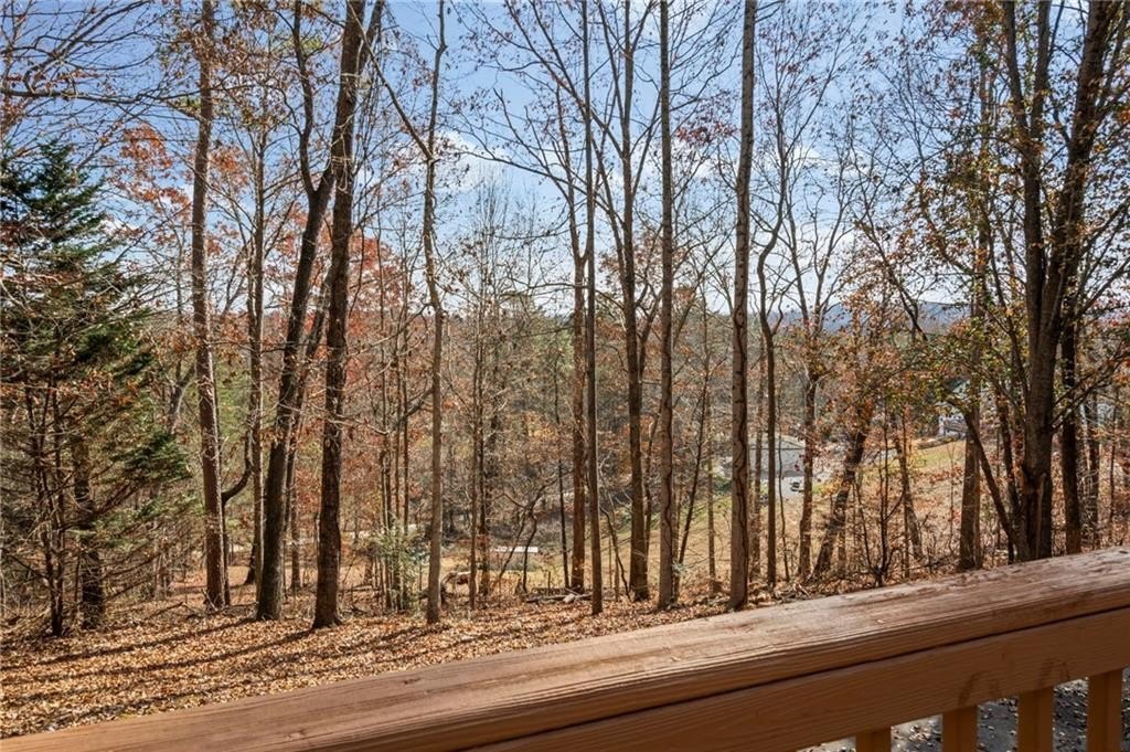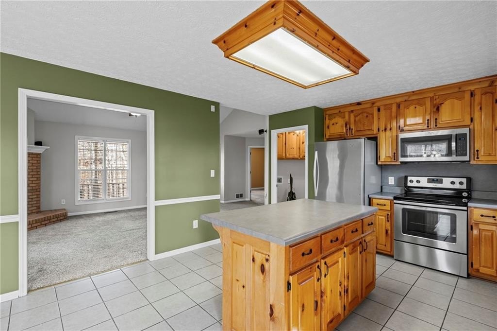 The spacious kitchen features warm knotty-pine cabinetry, stainless steel appliances, an island for prep or casual dining, and direct access to the back deck, perfect for enjoying the surrounding trees and seasonal views. The kitchen opens to a large living room with a vaulted ceiling and a brick fireplace that adds a cozy focal point for gatherings.