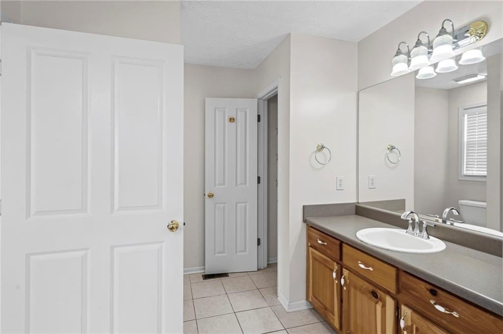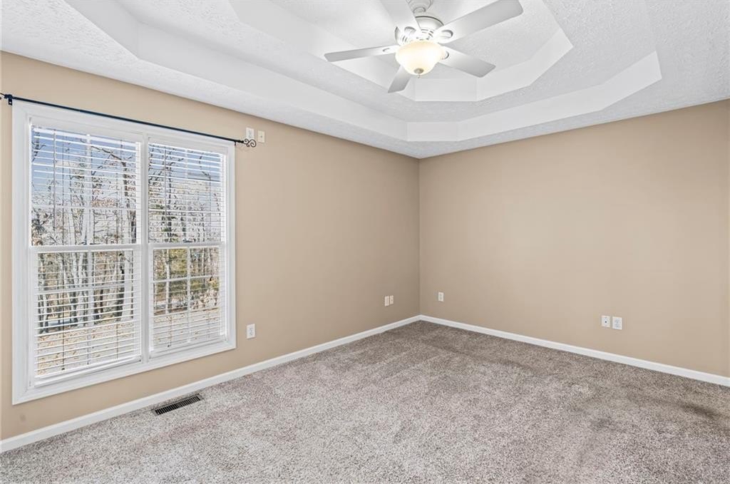 The primary suite offers a roomy layout with dual closets, a tray ceiling, and an en-suite bath with double sinks and a large shower-tub combo. Two additional bedrooms and a second full bath provide flexibility for family, guests, or a home office.