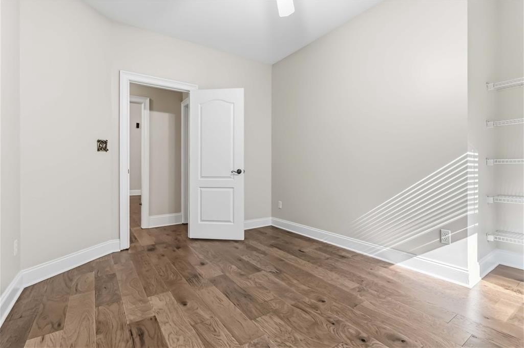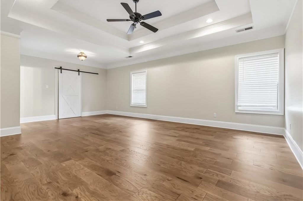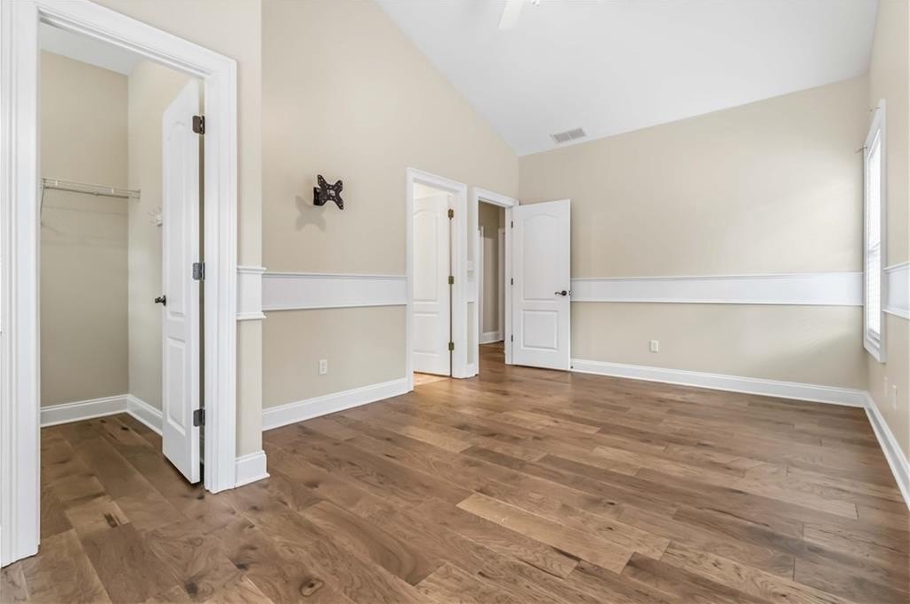 The oversized primary suite on the main level is complete with separate his-and-hers walk-in closets, individual vanities, abundant storage, a relaxing soaking tub, and a spacious tiled shower with glass doors.