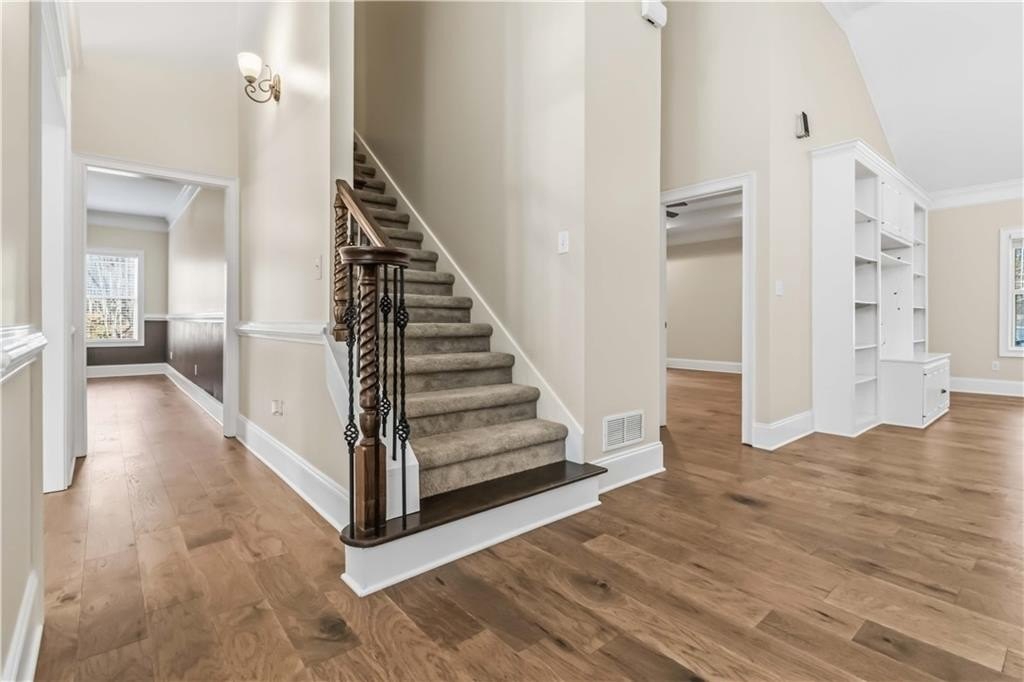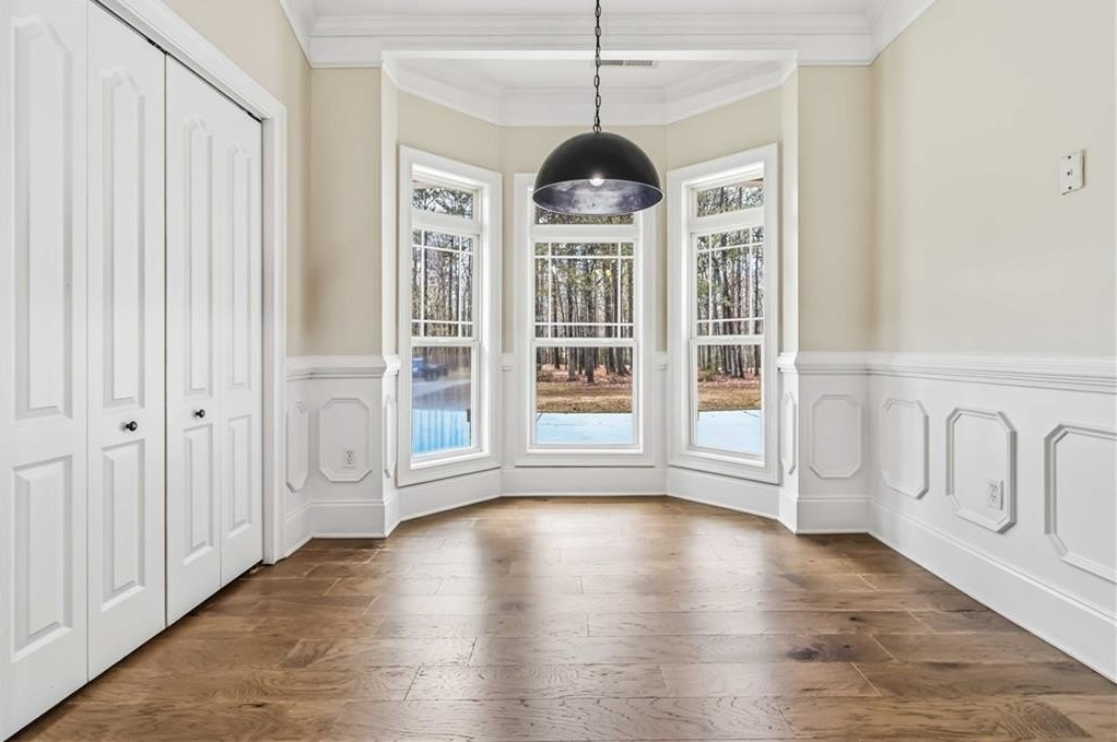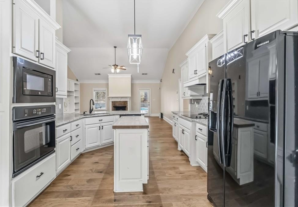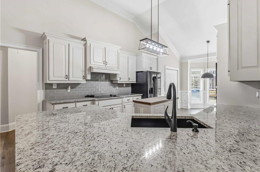 On the main level, you’ll find two separate living areas, a dedicated laundry room, a separate dining room, and a versatile bonus room perfect for a playroom or private office. The open-concept kitchen and living room feature vaulted ceilings, updated granite countertops, tile backsplash, kitchen island, white cabinetry, modern light fixtures, and a cozy breakfast nook.