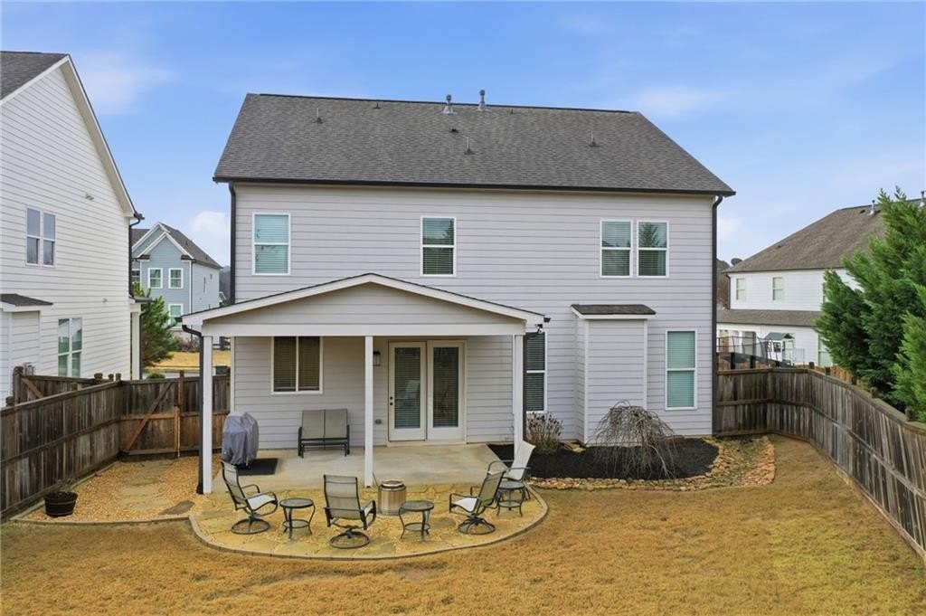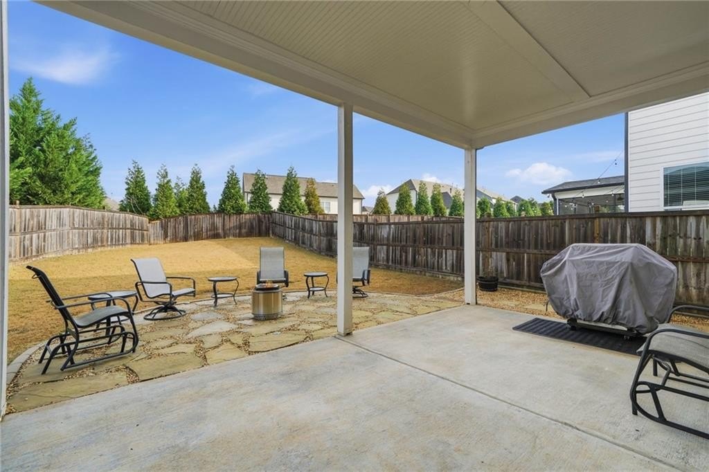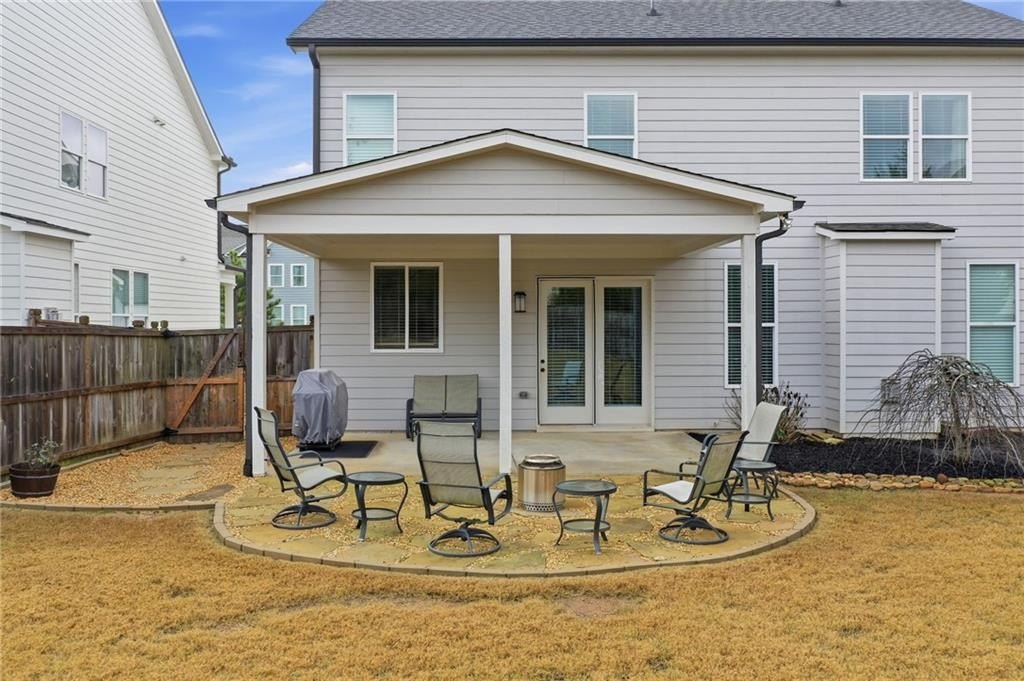As you move toward the heart of the home, the main living area opens up into a warm, comfortable space centered by a fireplace framed with custom built-ins—an elegant touch that elevates the entire room. The kitchen blends seamlessly into this area, offering crisp white cabinetry, bright countertops, and a casual dining area perfect for slow mornings or effortless weeknight meals. From here, step out onto the covered back patio and enjoy the fenced backyard—a wonderful extension of your living space for outdoor lounging, entertaining, or letting pets roam freely.