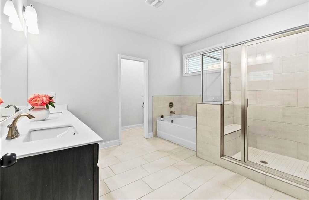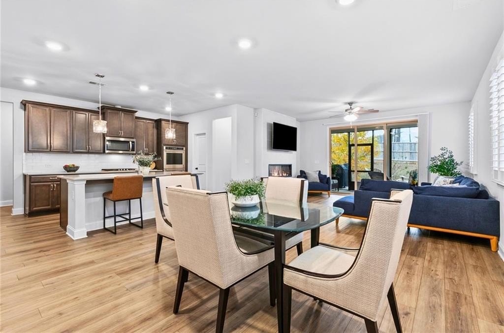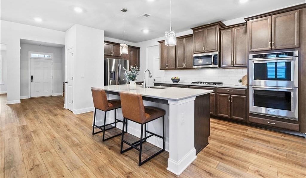 Inside, over 3,100 square feet of beautifully appointed interiors offer 9-ft ceilings, luxury vinyl flooring, smart-home upgrades, and elegant finishing touches at every turn. The chef’s kitchen serves as the centerpiece for both everyday living and holiday entertaining, featuring an oversized quartz island, gas cooktop, double oven, walk-in pantry, and generous bar seating.