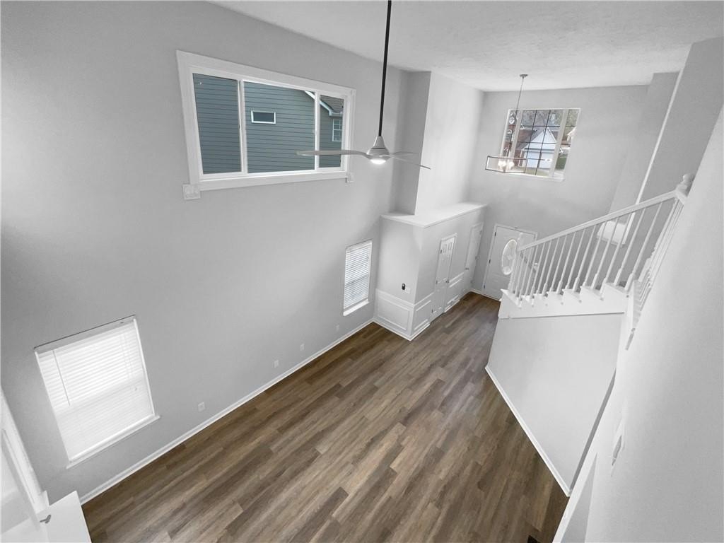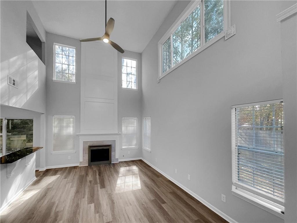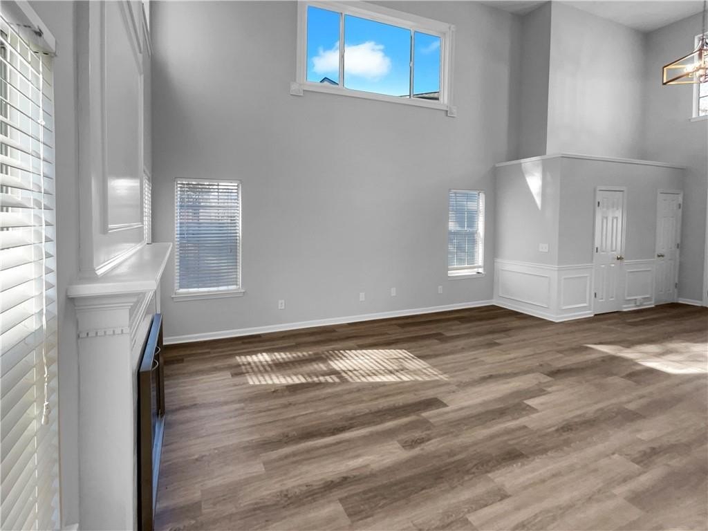 inside, you're welcomed by a stunning two-story great room, filled with natural light from its soaring windows and anchored by a beautiful fireplace—a perfect space