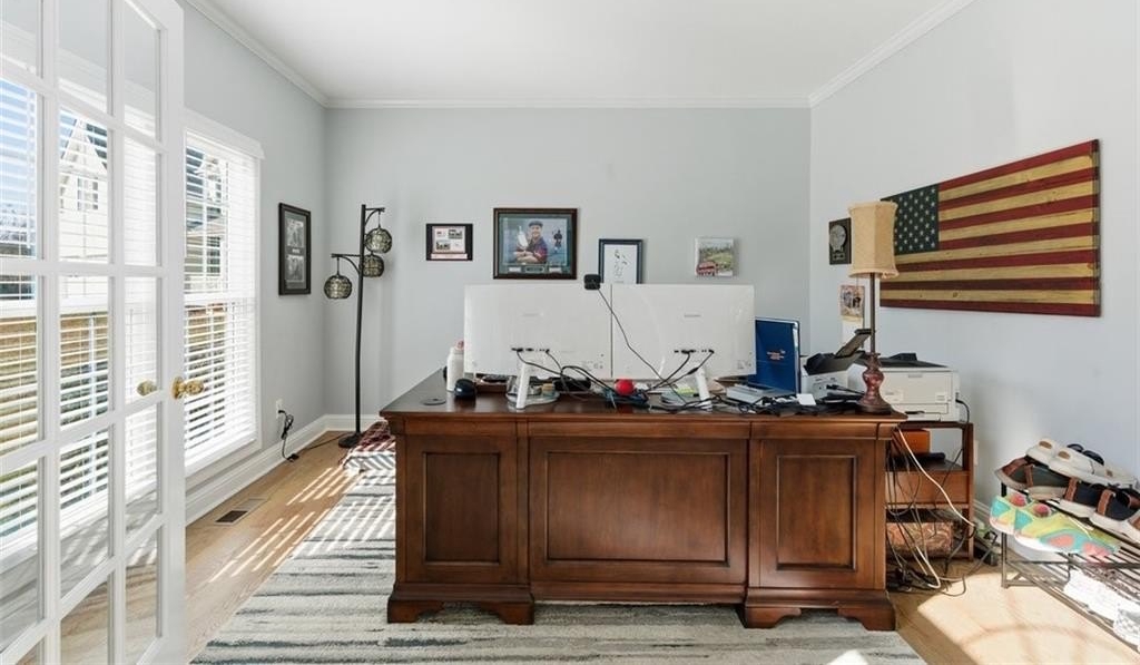 Welcome to this beautiful home tucked away on a peaceful cul-de-sac in a quiet neighborhood enclave in the highly sought-after West Cobb area. Step into the charming foyer with warm wood flooring, and you’ll immediately notice the glass doors leading to a bright home office—perfect for work-from-home days.