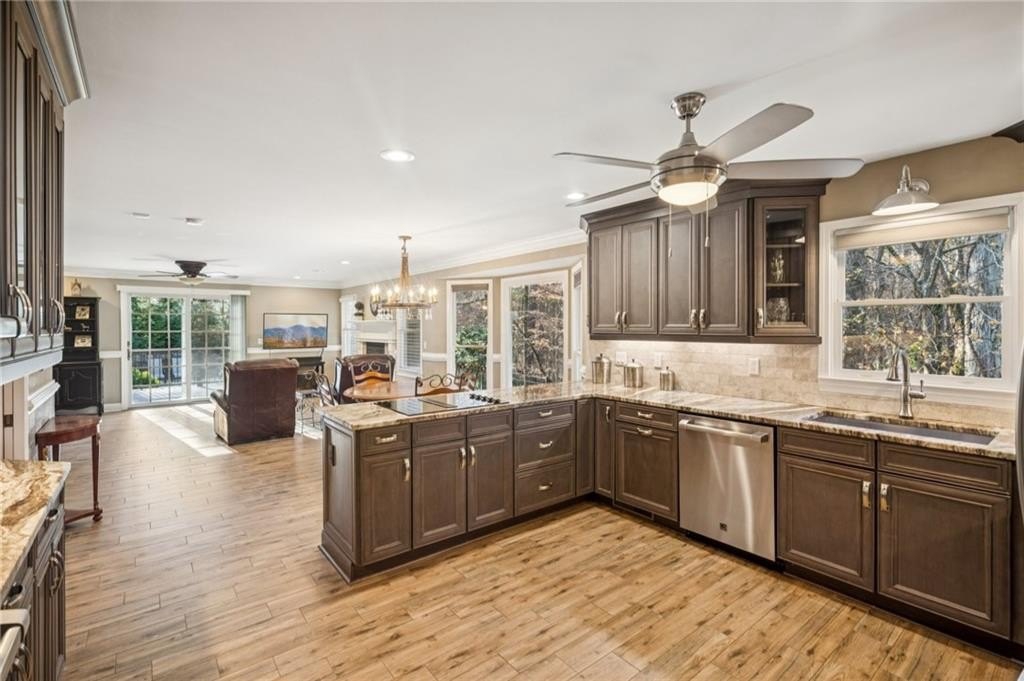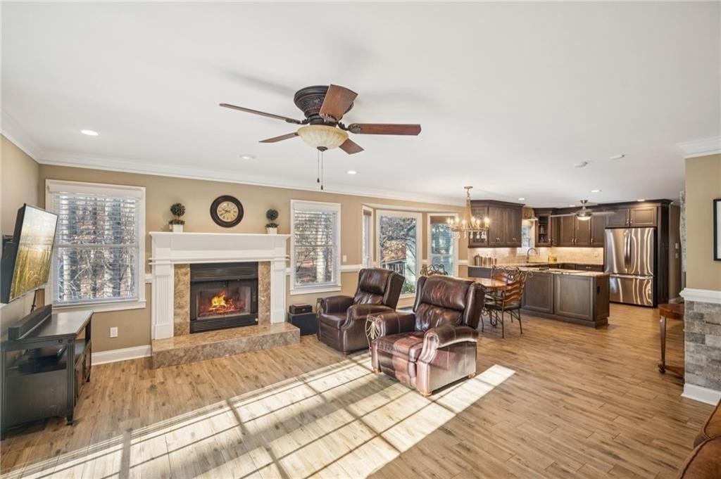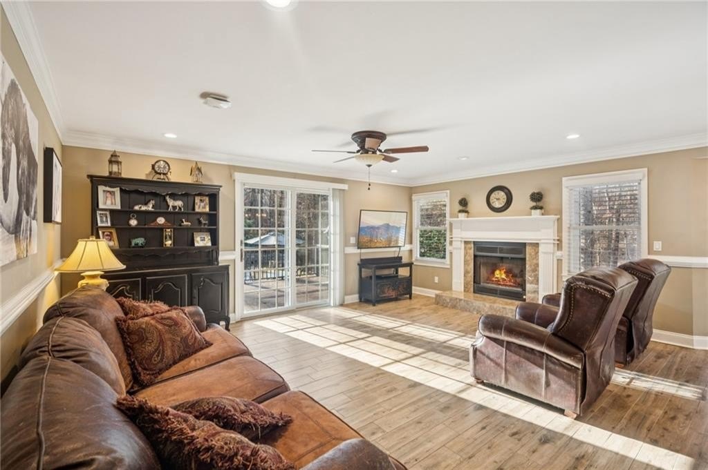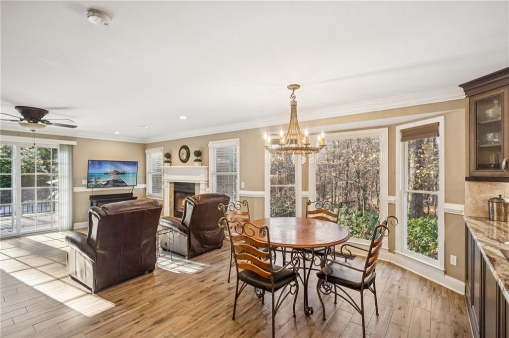 The spacious family room features a cozy gas fireplace and Andersen sliding doors that provide additional access to the expansive 40×14 composite deck—perfect for seamless indoor-outdoor living and gatherings.