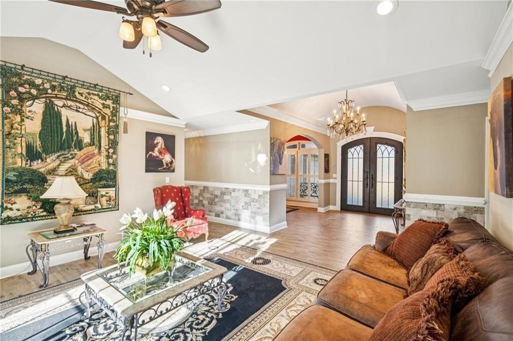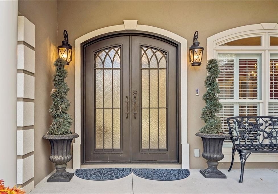 Step through double iron doors into a bright, welcoming foyer where designer details set the tone for the rest of the home. The dining room’s 10-ft ceilings create an elegant backdrop for memorable meals. Just beyond, the living room opens to views of the secluded backyard oasis, offering a serene transition to the outdoor retreat.