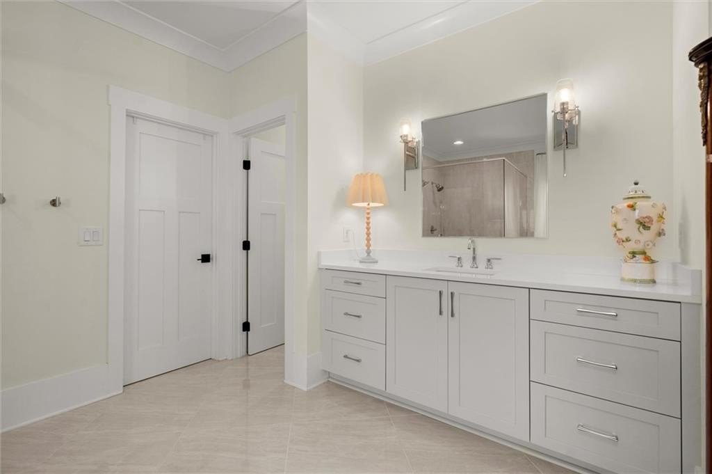 Upstairs, the master suite is a true retreat, complete with a designer ceiling, a luxurious ensuite with double vanities, a walk-in shower, a freestanding tub, and an impressive walk-in closet. The two secondary bedrooms each have walk-in closets and separate vanities.