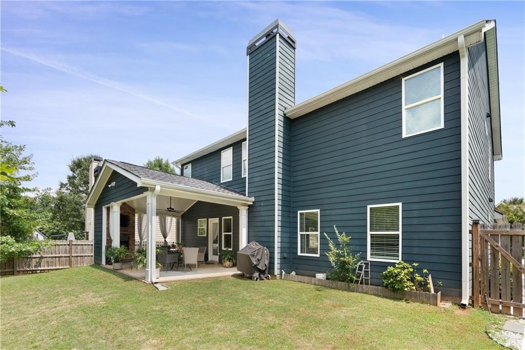 Step outside to enjoy the fenced backyard retreat: a custom-built covered porch (added in 2022) with a fireplace, mounted TV, and outdoor speakers, ideal for relaxing or entertaining year-round.