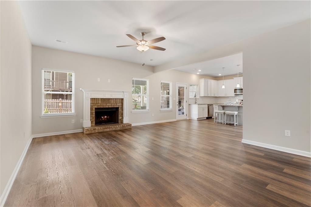 On the main floor, you’ll find stylish LVP flooring, a private office, a guest bedroom and full bathroom. The formal dining room with stunning coffered ceilings, perfect for gatherings and special occasions. The modern kitchen features granite countertops, island, and white cabinetry, flowing into a cozy living room complete with a fireplace, ideal for everyday living and entertaining.