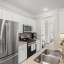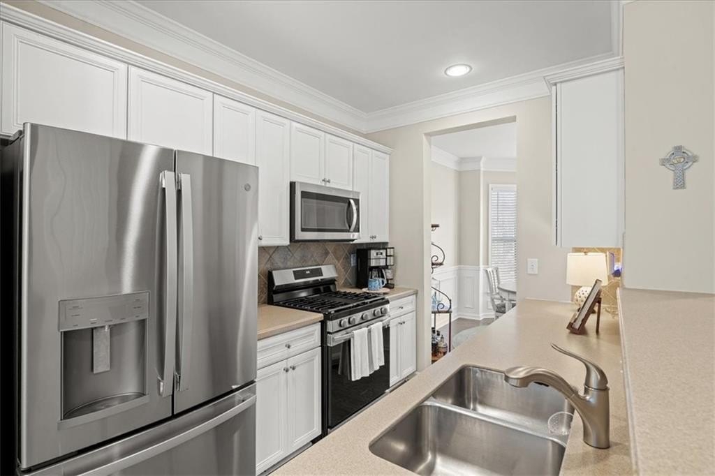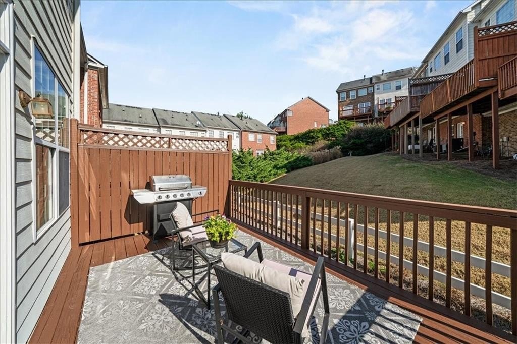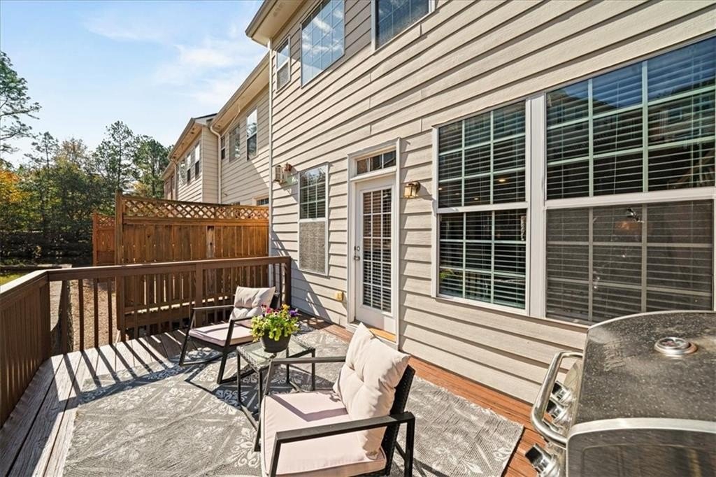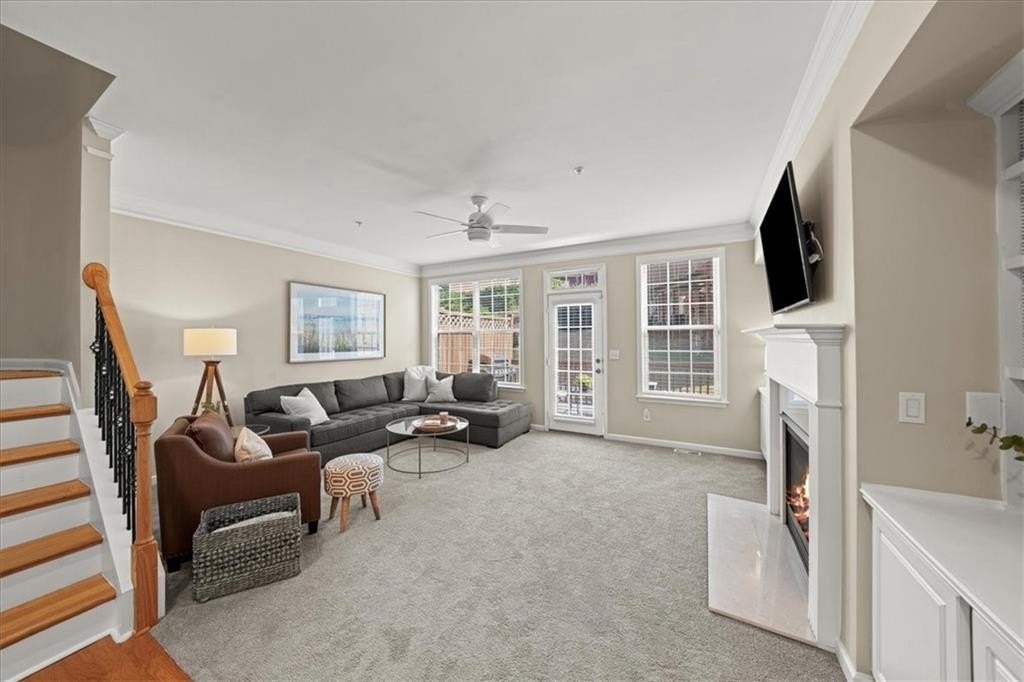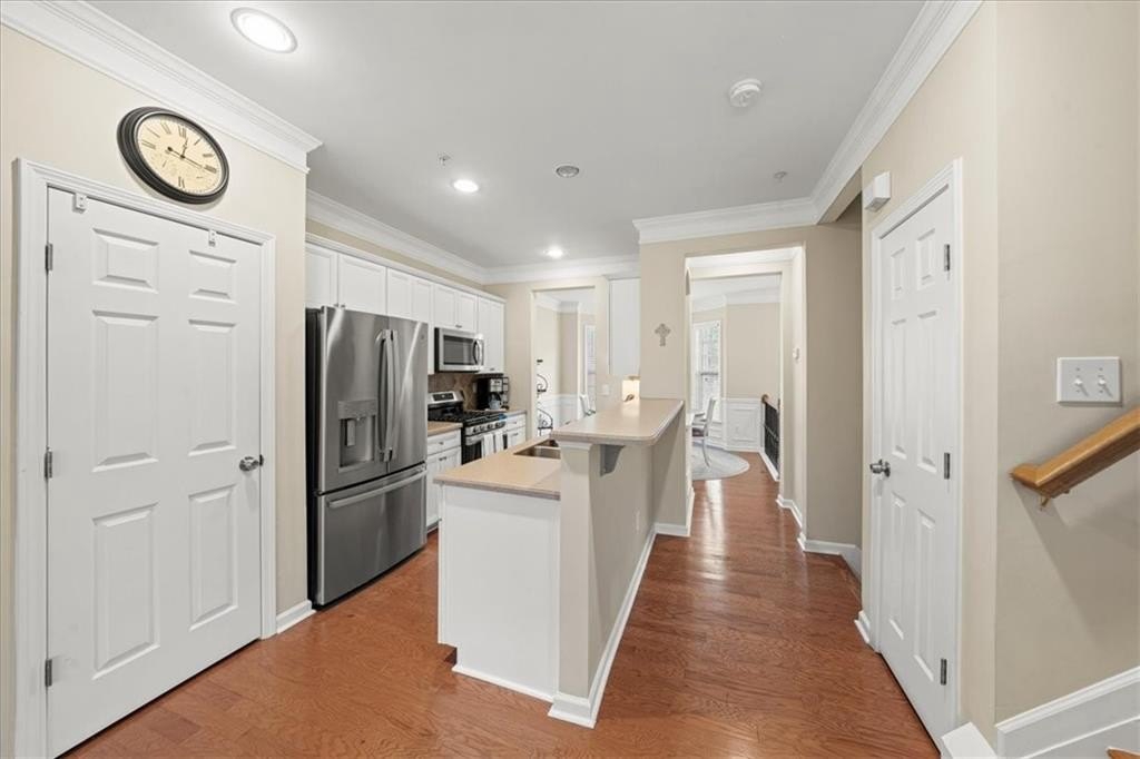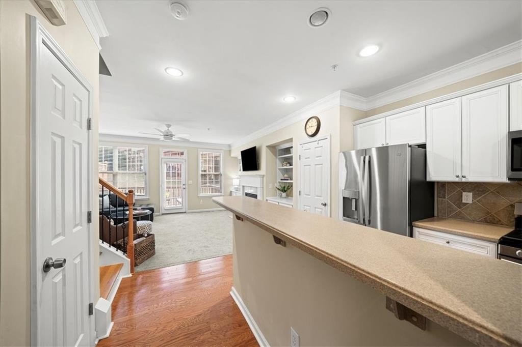 Gorgeous and fresh townhome with a smart, functional layout in Smyrna. The foyer opens to an elegant dining area filled with natural light, complete with wainscoting and hardwood floors. The kitchen offers white cabinetry, upgraded stainless steel appliances, countertop seating, a pantry, and a seamless connection to the large living room. The living room is bright and inviting with charming built-ins that frame a gas fireplace. A private deck overlooks peaceful greenspace, and a half bath on the main level is ideal for guests.