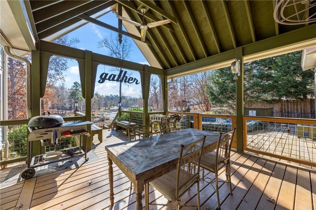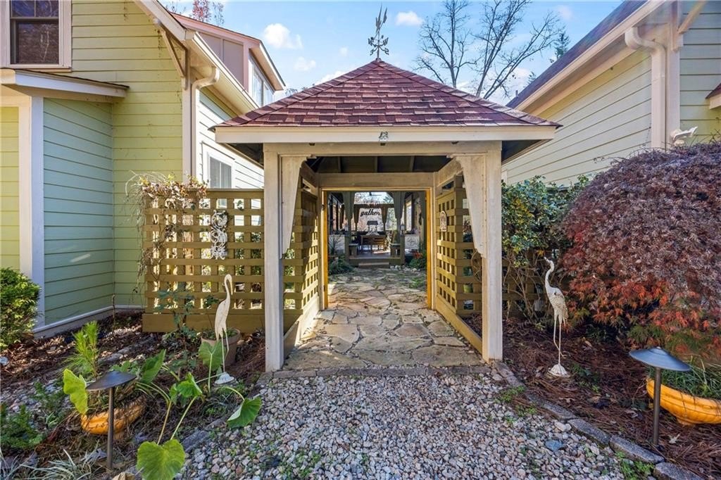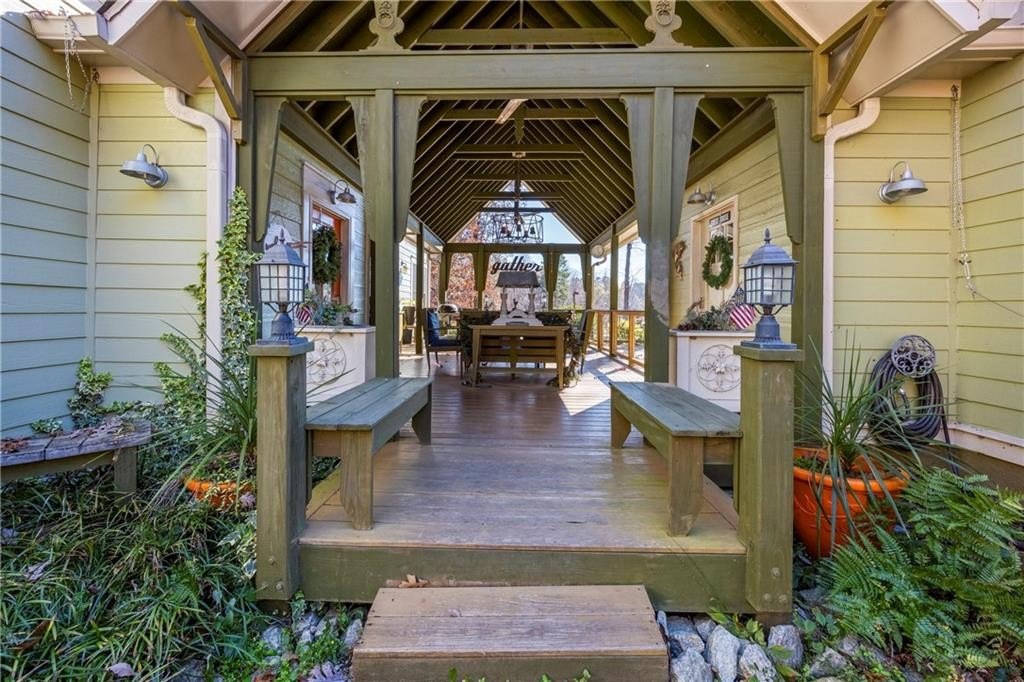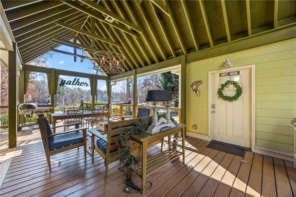 At the center of the property is a unique open-air breezeway that connects the home and cottage. This space is perfect for shared meals, morning coffee, or simply enjoying the sights and sounds of the lake. The large fenced backyard includes a fire pit and plenty of room for outdoor gatherings, all with beautiful views of the cove.