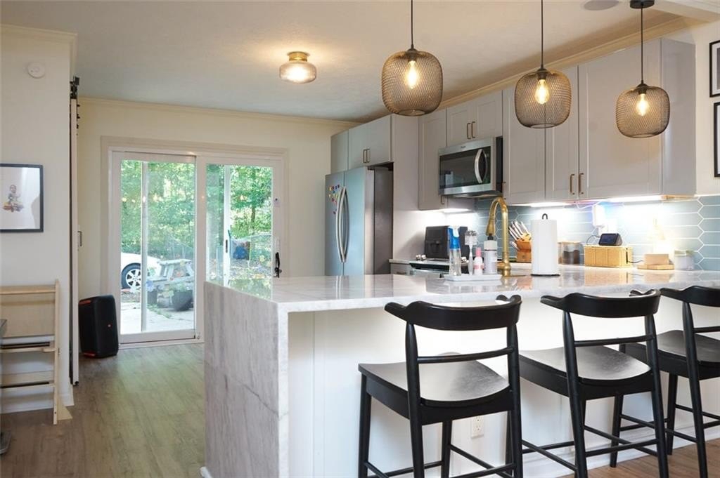 Cook in style in a kitchen that features quartz countertops and built-in Bluetooth speakers, making meal prep and hosting even more enjoyable. Bathrooms have been thoughtfully updated, along with modern fixtures and LVP flooring throughout the home for a seamless, contemporary look.