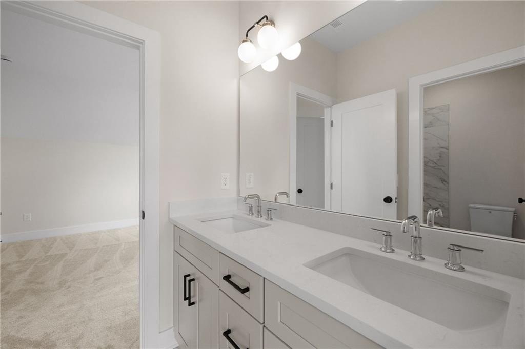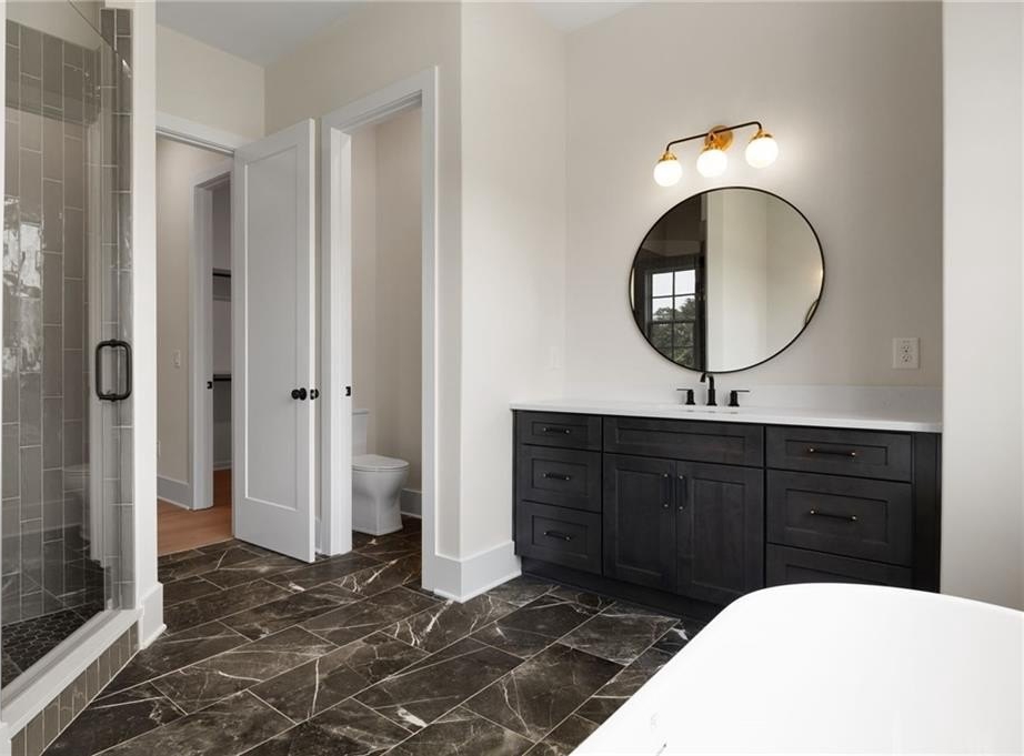 This home welcomes you with a spacious great room that includes a custom fireplace, ample natural lighting, and access to the covered patio. From the great room enjoy views to the gourmet kitchen, which is a chef’s dream, and includes premium Wolf and Bosch stainless steel appliances, an oversized island, quartz countertops, soft-close cabinetry, and walk-in pantry. This plan also showcases a true retreat with the primary suite, privately located on the main level. Unwind in the ensuite spa inspired primary bath that offers hers and his vanities and closets, soaking tub, and large tiled shower. Additional main floor highlights include an open dining area perfect for entertaining, private pocket office, laundry room, mudroom and powder room.