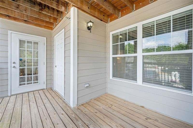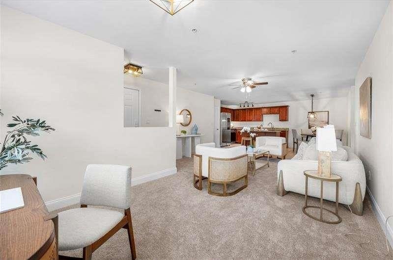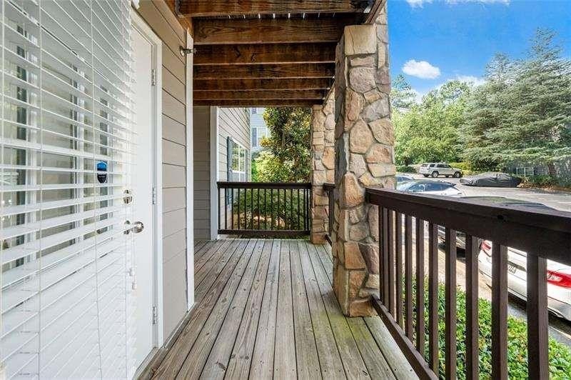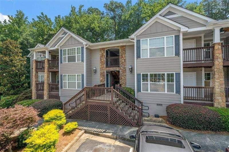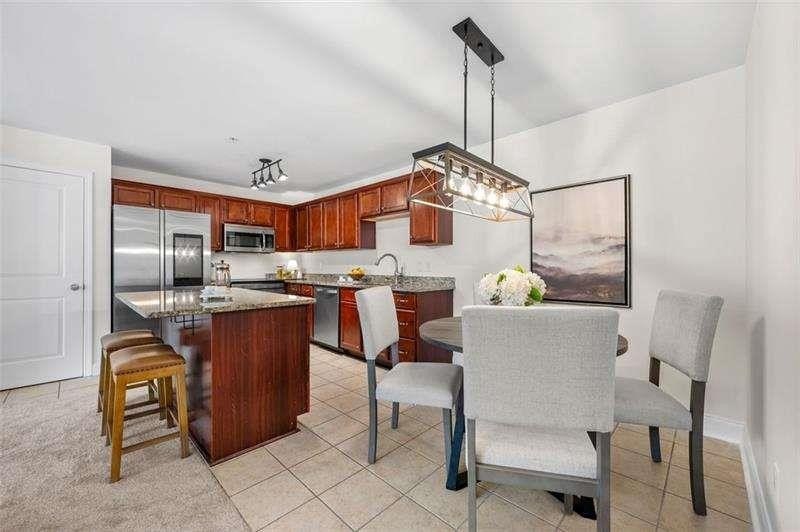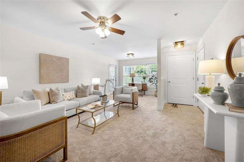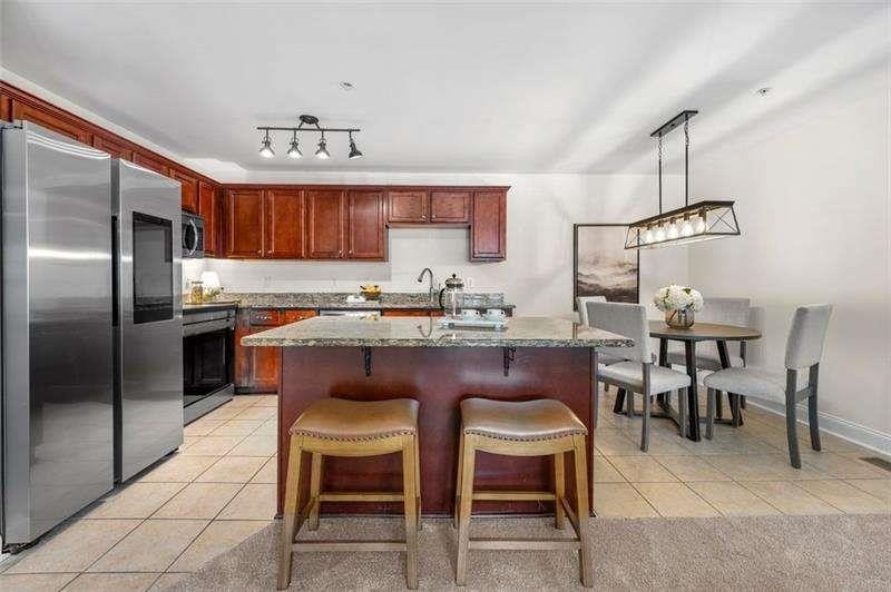 VA Loan Assumption with 5.25% interest rate available! Welcome home to this ground floor, 2 bedroom, 2 bathroom condo in the heart of Smyrna. With fresh paint and carpet throughout and updated kitchen and baths, this home is fully move-in ready. The living space is open-concept with views to the dining area and kitchen. The kitchen is both functional and inviting, offering granite countertops, an island with barstool seating, a pantry, and all stainless steel appliances included (including a Smart fridge!). Off of the living room is a spacious covered balcony - perfect for morning coffee or evening relaxation. The oversized primary suite features ample natural light, a walk-in closet, and a spa-like bath featuring a large vanity, soaking tub, and separate, frameless, tiled shower. Both bathrooms are finished with tile surround tubs and flooring and granite countertops. A full laundry room in the hallway can accommodate side-by-side washer and dryer for added convenience. Don't miss the community amenities including a pool, fitness center, and clubhouse. Located just a short walk from parks, playground and the restaurants and shops of Smyrna Market Village. Minutes from the Atlanta Braves stadium/Truist Park, The Battery, and quick access to I-285 & I-75, this condo is perfectly positioned for both work and play. HOA includes water/sewer, trash service, and the pool/fitness center!