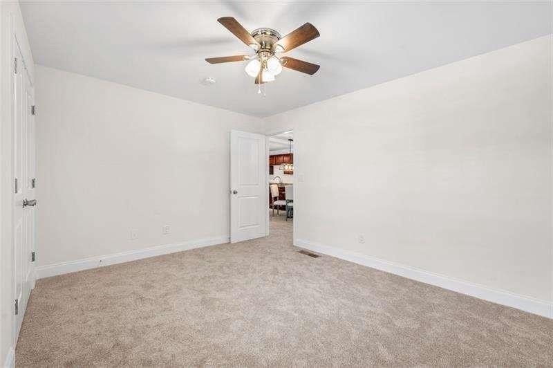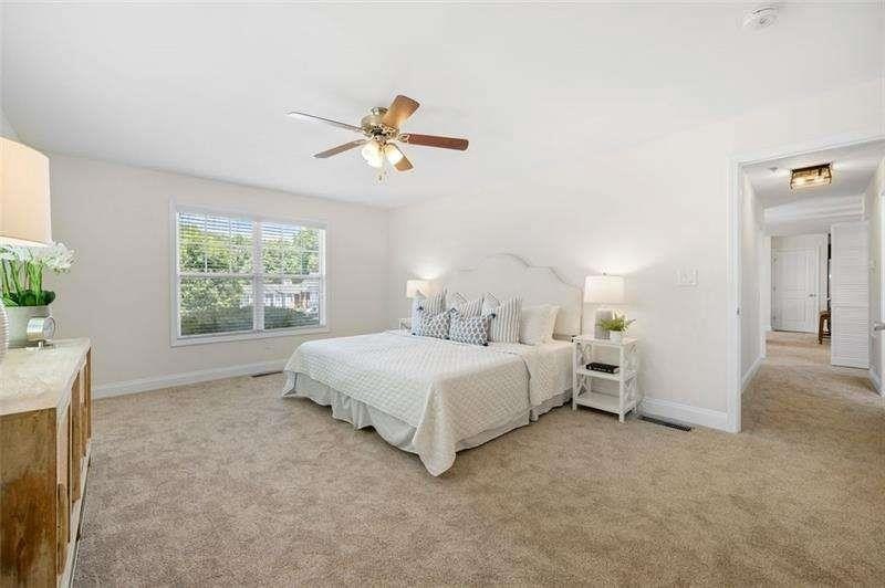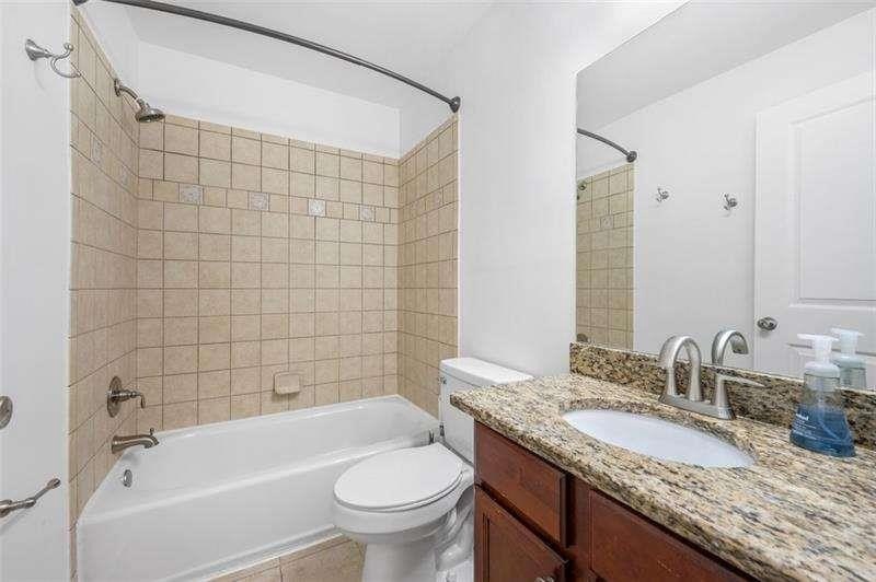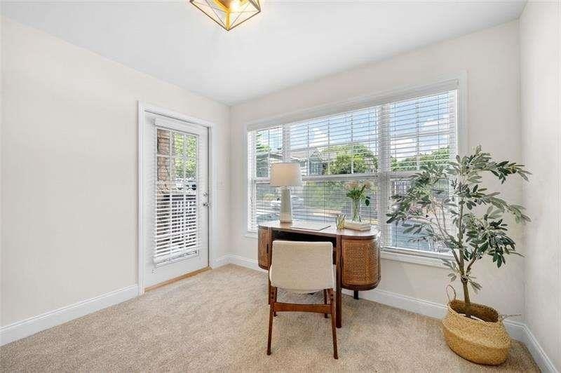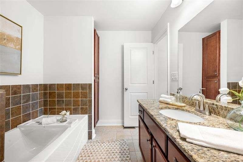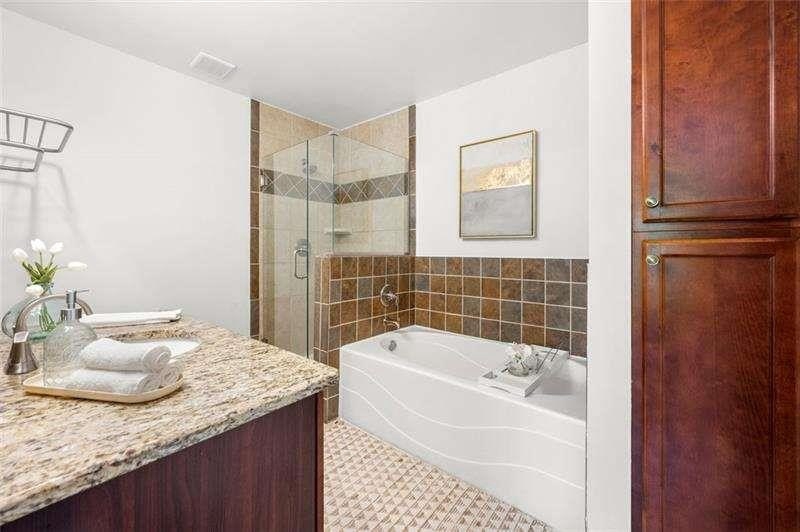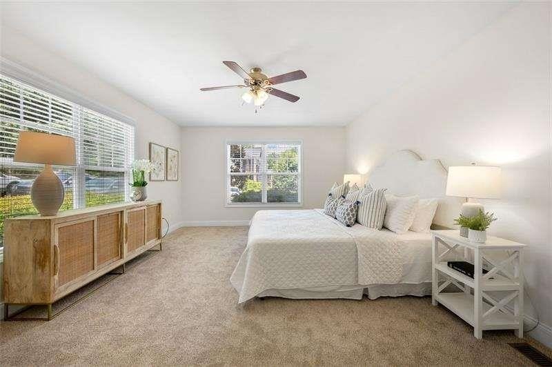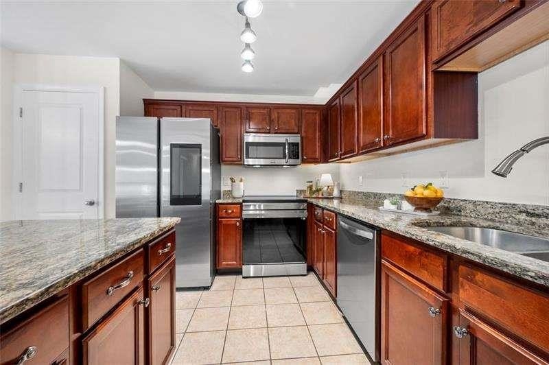 VA Loan Assumption with 5.25% interest rate available! Welcome home to this ground floor, 2 bedroom, 2 bathroom condo in the heart of Smyrna. With fresh paint and carpet throughout and updated kitchen and baths, this home is fully move-in ready. The living space is open-concept with views to the dining area and kitchen. The kitchen is both functional and inviting, offering granite countertops, an island with barstool seating, a pantry, and all stainless steel appliances included (including a Smart fridge!). Off of the living room is a spacious covered balcony - perfect for morning coffee or evening relaxation. The oversized primary suite features ample natural light, a walk-in closet, and a spa-like bath featuring a large vanity, soaking tub, and separate, frameless, tiled shower. Both bathrooms are finished with tile surround tubs and flooring and granite countertops. A full laundry room in the hallway can accommodate side-by-side washer and dryer for added convenience. Don't miss the community amenities including a pool, fitness center, and clubhouse. Located just a short walk from parks, playground and the restaurants and shops of Smyrna Market Village. Minutes from the Atlanta Braves stadium/Truist Park, The Battery, and quick access to I-285 & I-75, this condo is perfectly positioned for both work and play. HOA includes water/sewer, trash service, and the pool/fitness center!
