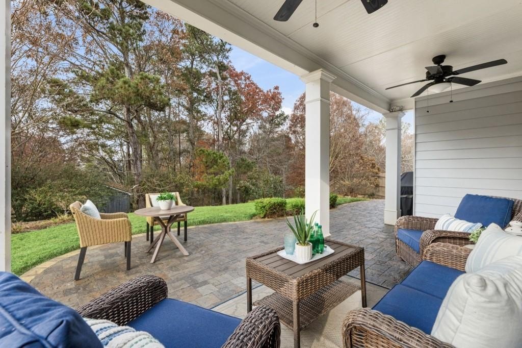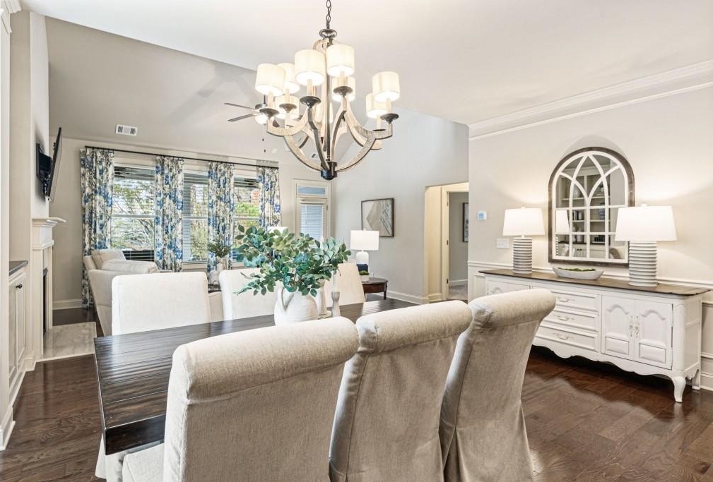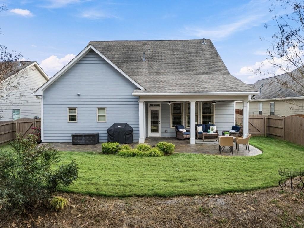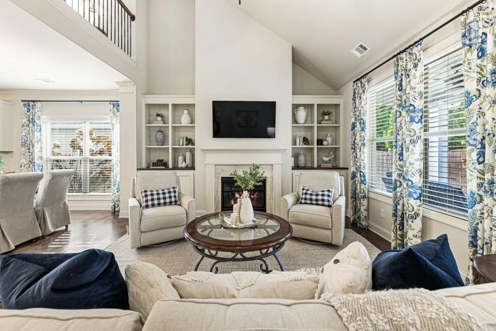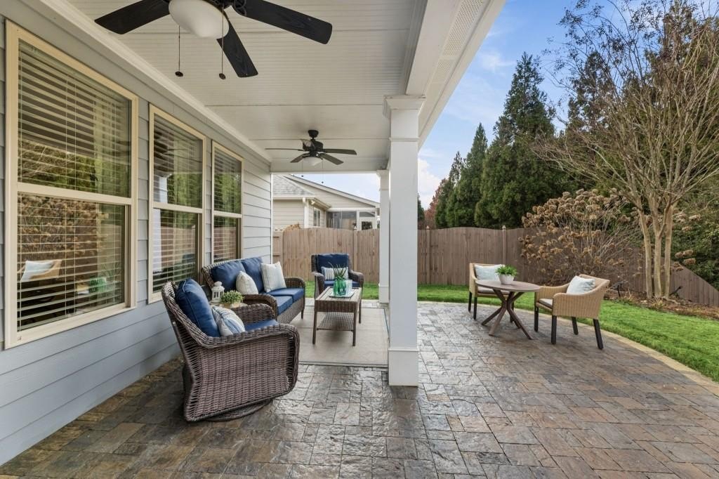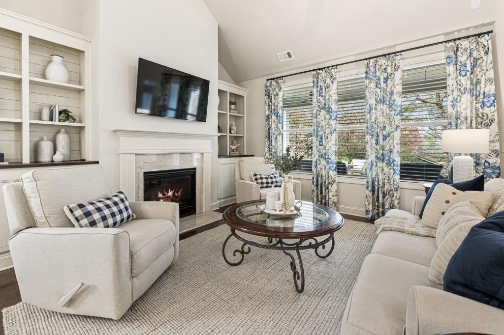 Beautifully designed and perfectly maintained, this home offers easy living with a primary on main and open concept with a back wall of windows overlooking the private backyard. The walkout backyard and huge covered patio space with upgraded stone is the ideal place for enjoying quiet mornings and evenings. The open, light-filled main floor plan creates a warm and inviting feel from the moment you enter. The large gourmet kitchen opens to the breakfast area and then the living room with the fireplace anchored by custom built-in bookcases with ship lap details. The convenient main-level laundry room and clever storage under the stairs keep everyday life organized and clutter-free. The chef's kitchen is upgraded with granite countertops, a large island for prep and gathering, a generous pantry, and upgraded appliances, including new LG double ovens, a KitchenAid dishwasher, and a KitchenAid gas cooktop. The main-level primary suite is a relaxing retreat with its own sitting room, an expansive shower, dual vanities, and a custom closet with built-in cabinetry. A second bedroom and full bath on the main level provide ideal flexibility for guests, an office, or everyday living. Upstairs, you'll find a third bedroom, full bath, spacious bonus room, and an abundance of storage floored and ready for your items. The exterior is just as inviting. The covered back patio has been upgraded with beautiful pavers, creating a comfortable outdoor living space that overlooks peaceful views of the neighboring farm where horses add charm and character to your day. Additional highlights include new gutters with a guard system and professionally maintained front and back landscaping covered by the HOA. This friendly community also offers a pool and guest house, making it easy to relax, entertain, and enjoy low-maintenance living. Schedule your tour today!