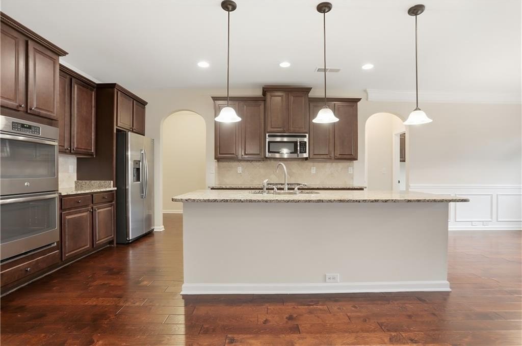 Stunning 5 bed, 3.5 bath home featuring fresh interior paint and new carpet. The first-floor primary suite complements an open living room with coffered ceilings and a stone fireplace. Enjoy a chef's kitchen with a gas cooktop, double ovens, a large island, and wood flooring throughout. Beautiful touches include wainscoting in the breakfast room, arched doorways, and vaulted bedroom ceilings. Private backyard completes this impressive home.