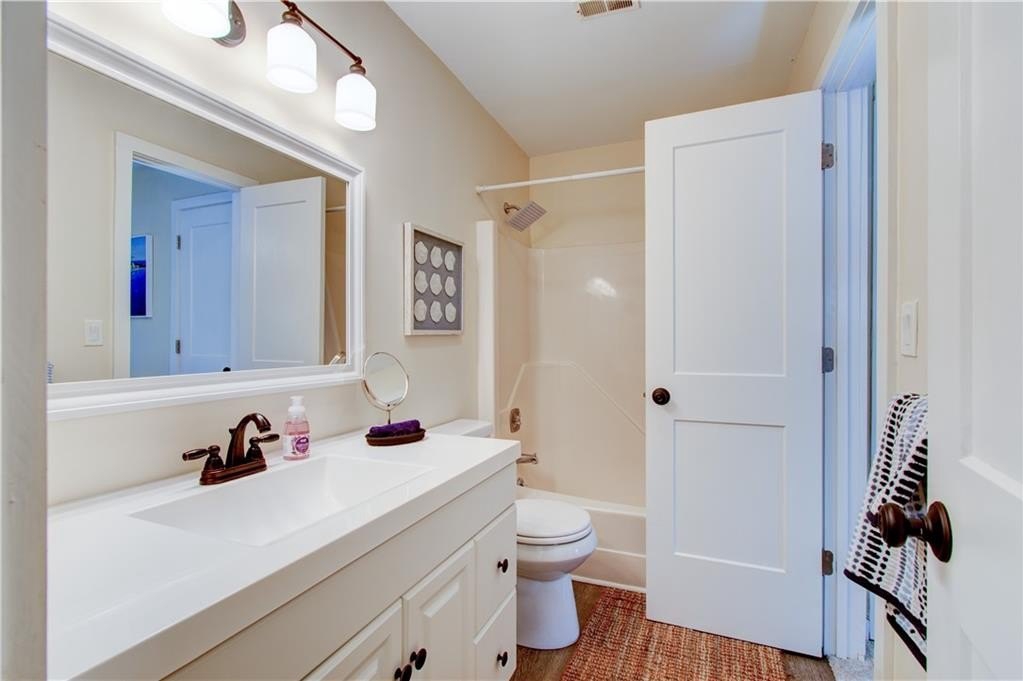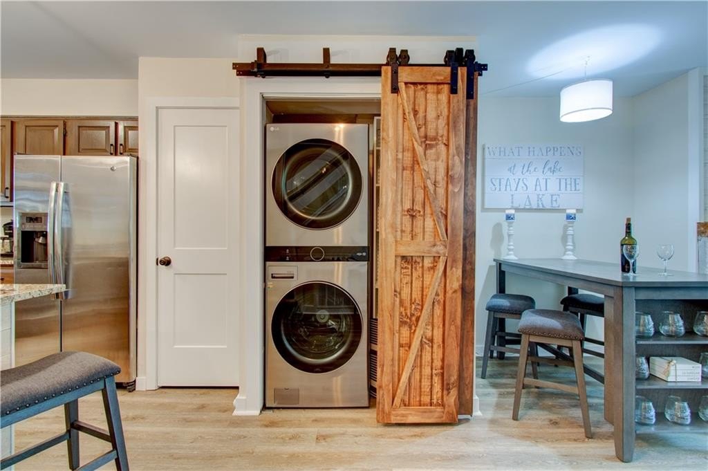 Fully renovated 2-bedroom condo in Lake Arrowhead. Open floor plan with updated kitchen (stainless appliances, granite, refinished cabinets), dining area with barn doors, and family room with stone fireplace and access to the back deck with seasonal lake views. Main level also includes a renovated half bath, storage, and laundry.