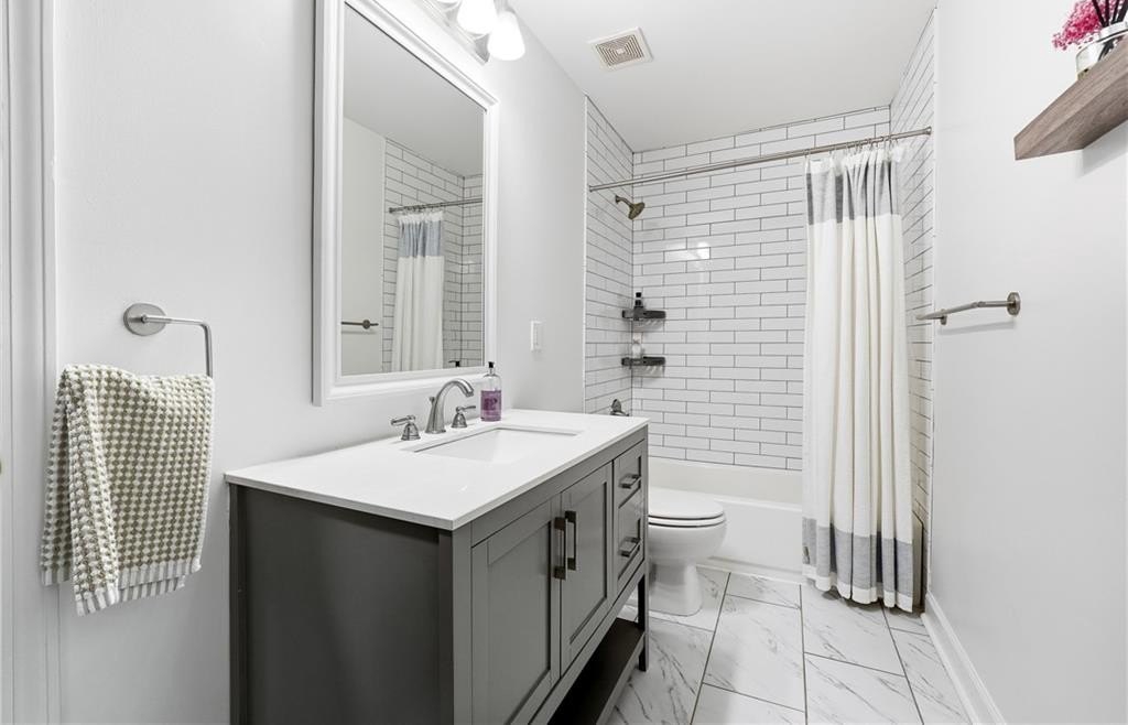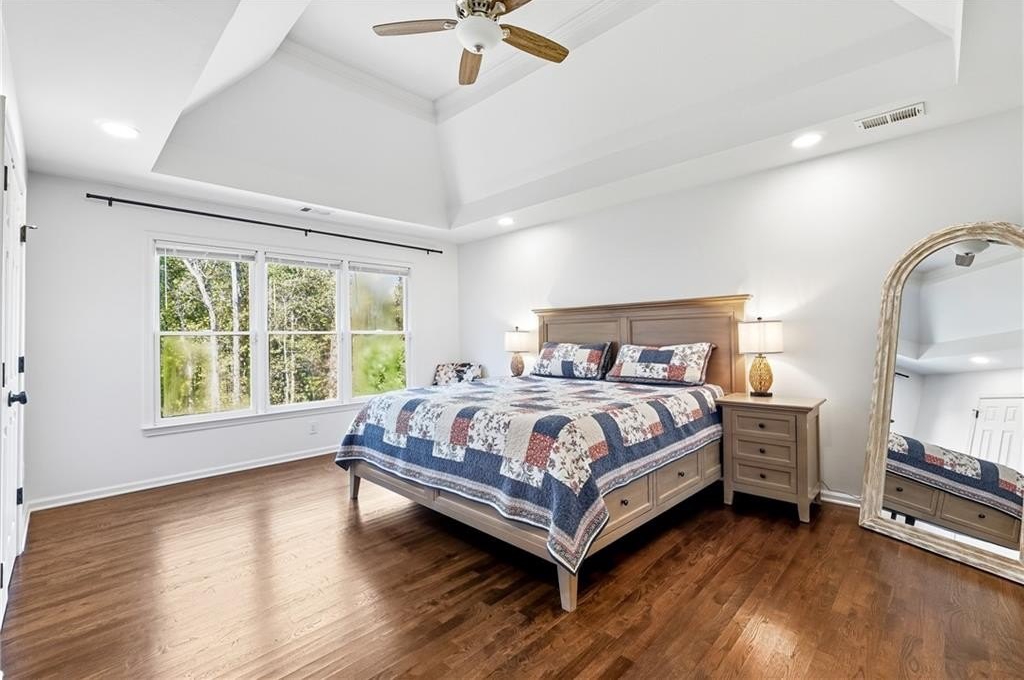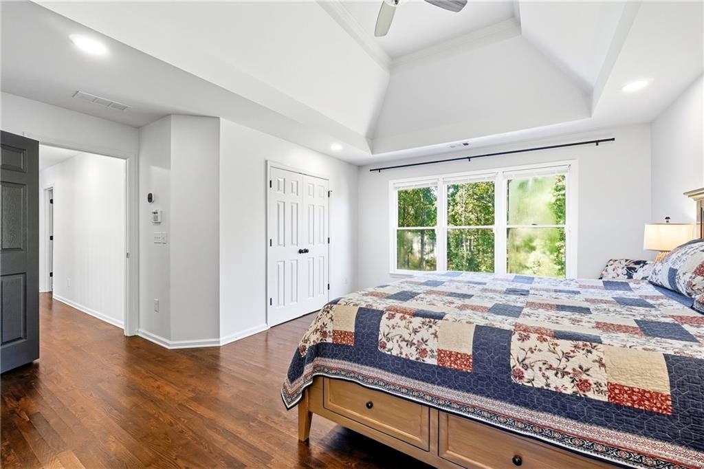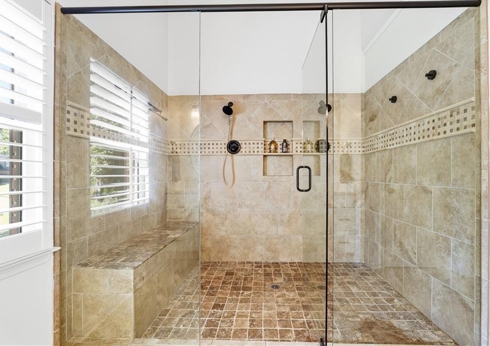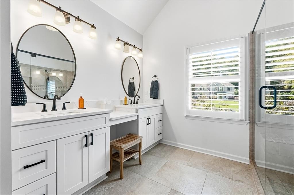 Retreat upstairs to the luxurious primary suite, enhanced by a tray ceiling, wooded views, and a sense of quiet privacy. The spa-inspired primary bath rivals boutique hotels, featuring new dual vanities, a makeup counter, and an expansive glass-enclosed shower with dual shower heads and a full-length bench. A generous walk-in closet completes the sanctuary.