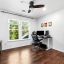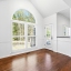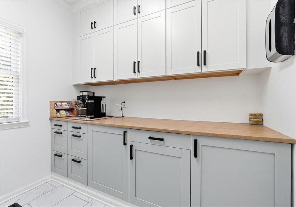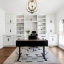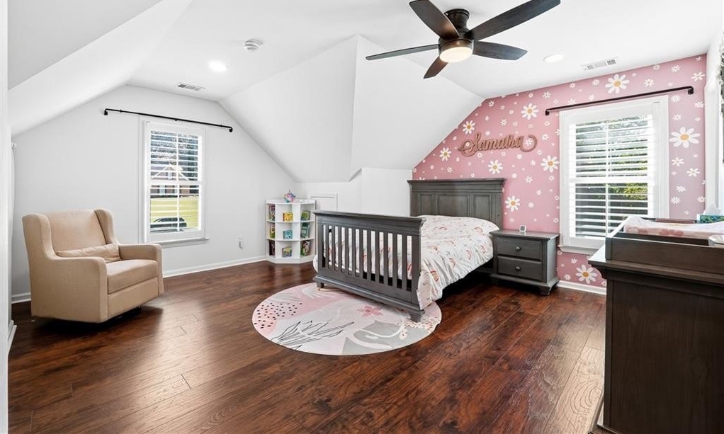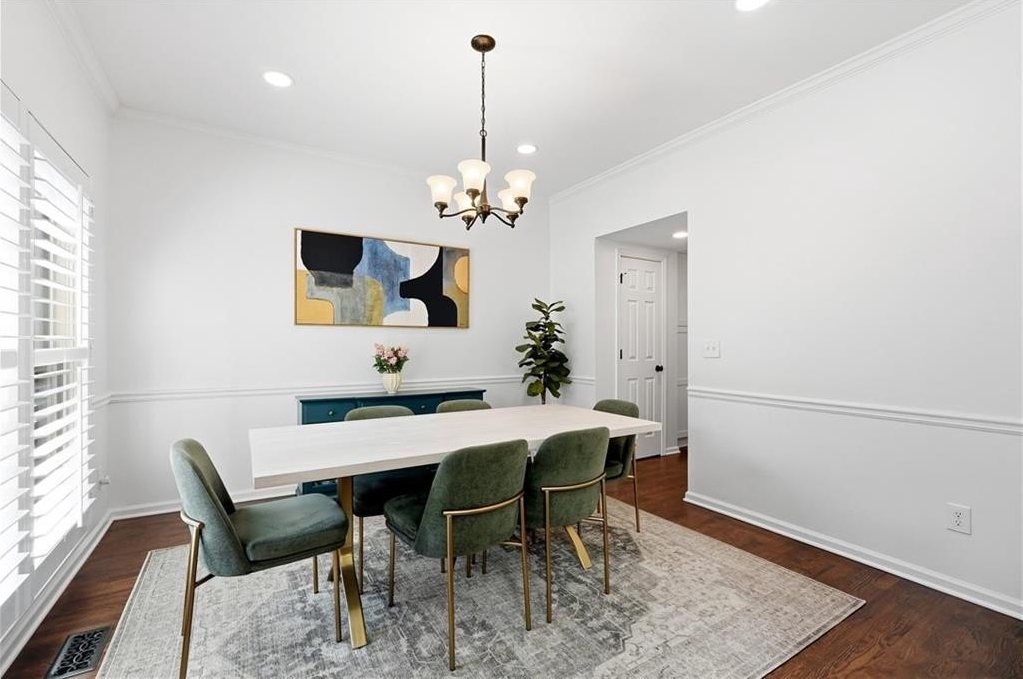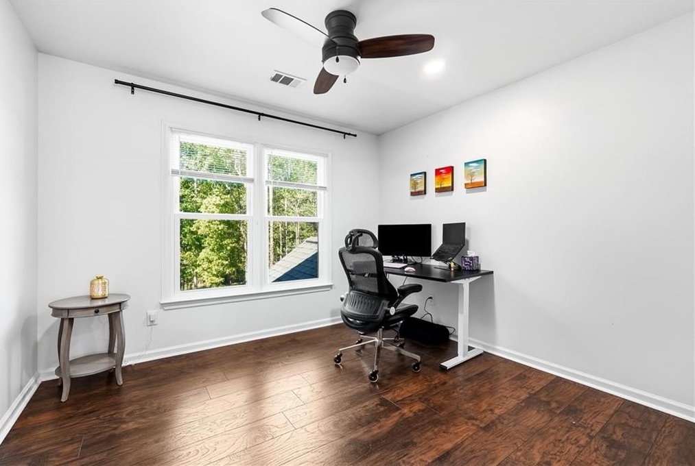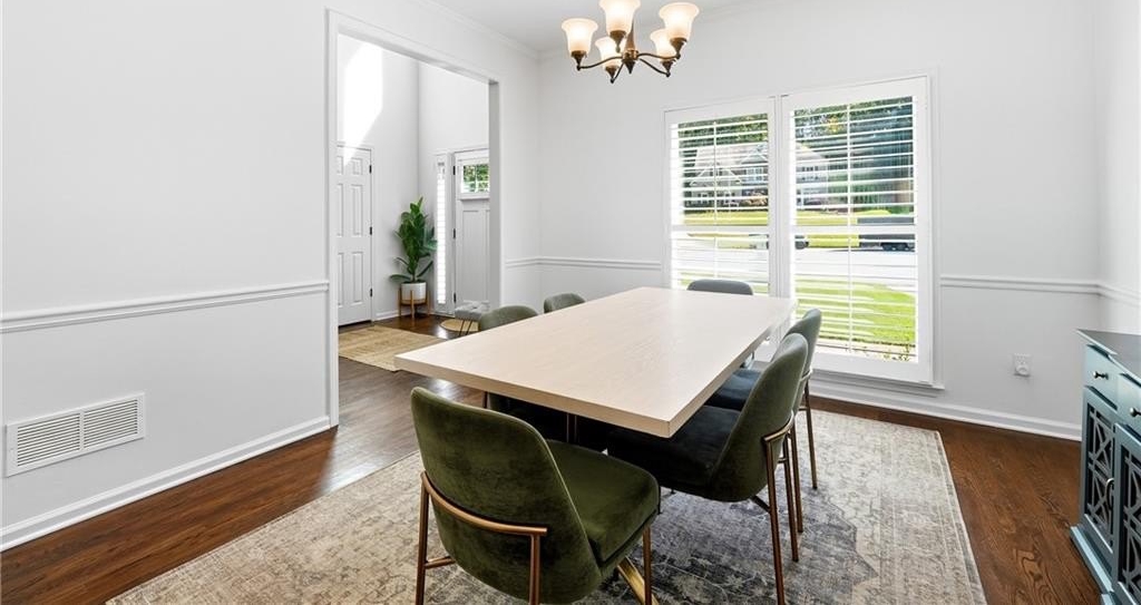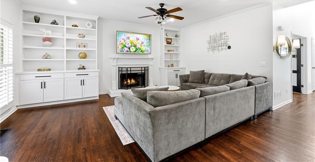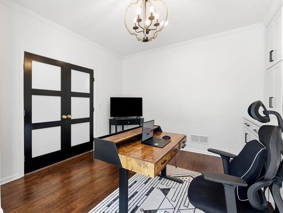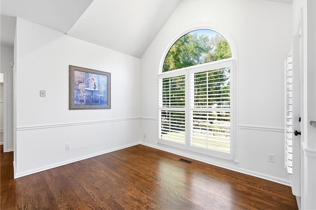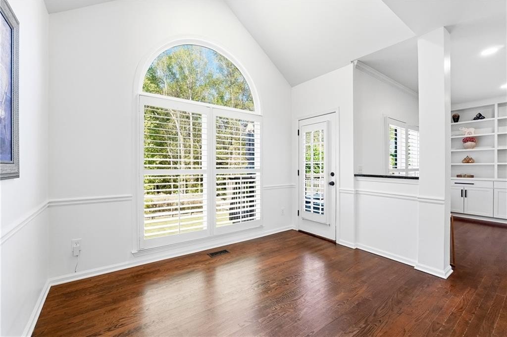 The two-story foyer sets the tone with rich hardwood floors that continue throughout the home. The expansive home office, framed by French doors and custom built-ins, provides an inspiring and private workspace with beautiful sunlight pouring through plantation shutters.