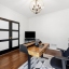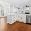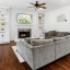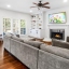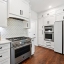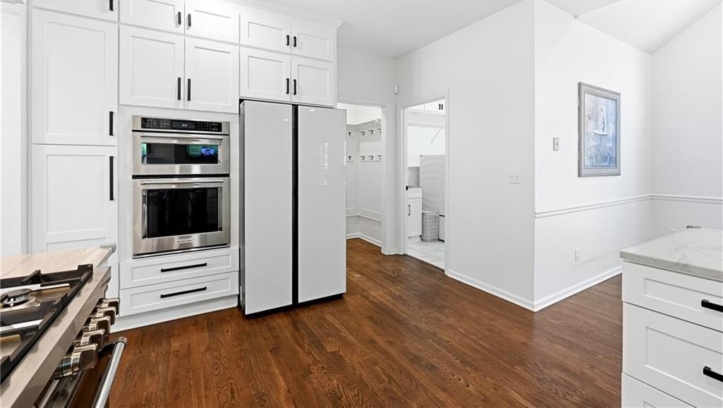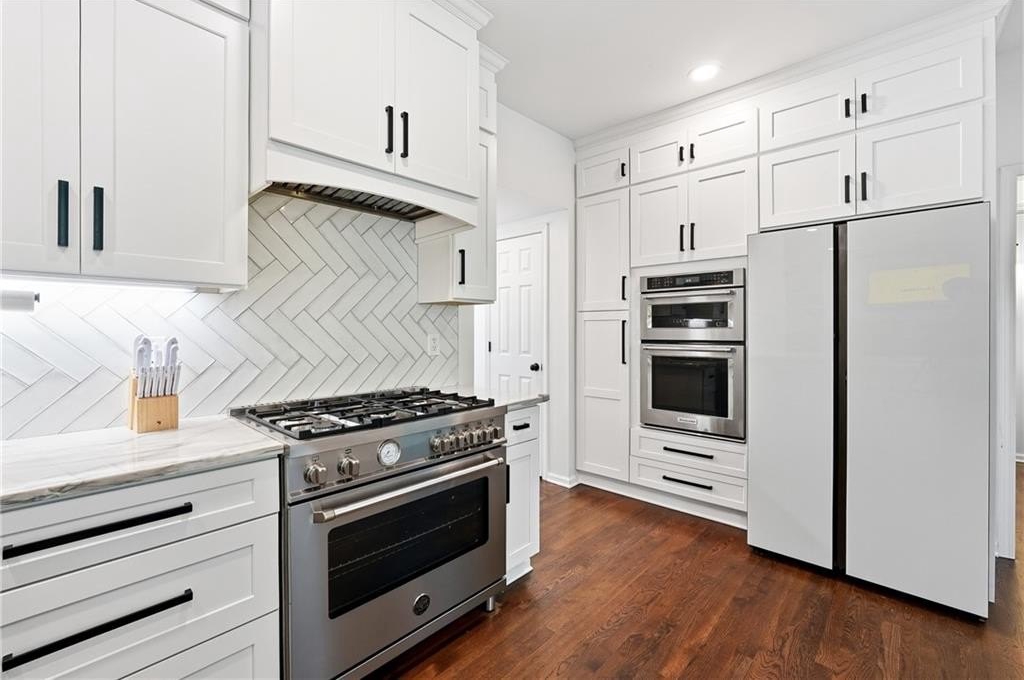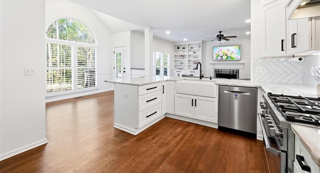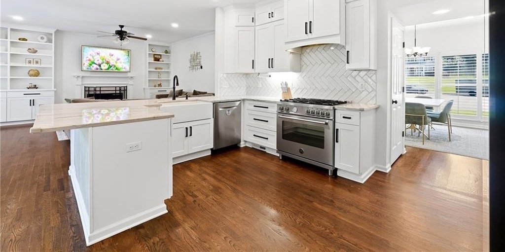 The showpiece of the home is the fully renovated gourmet kitchen—a culinary haven equipped with Bertazzoni Master Series appliances, quartz countertops, a striking chevron backsplash, and bespoke cabinetry. The kitchen opens seamlessly to a fireside living room anchored by custom-built shelving and an elegant mantel, creating the perfect environment for hosting and relaxation.