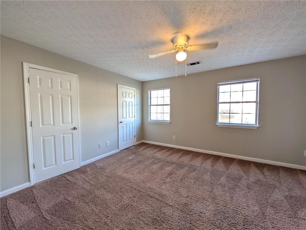 Easy viewing! Enter home with a spacious eat in kitchen, window that views into to Livingroom with double doors to back patio. Back patio has storage room. Half bathroom downstairs for your guest. Upstairs has two bedrooms each with a private bathroom. Home has washer dryer hook ups.