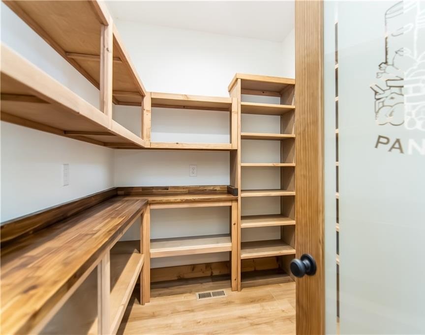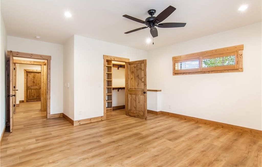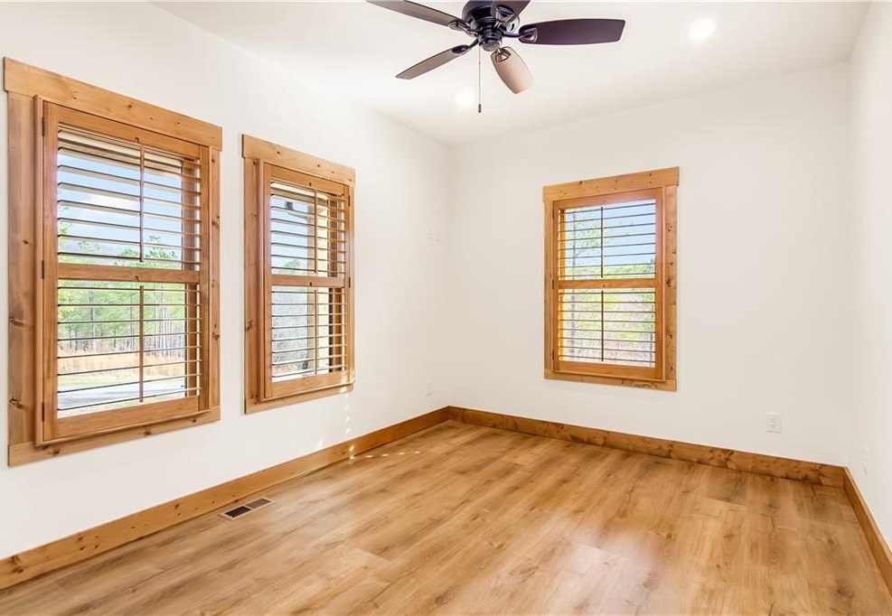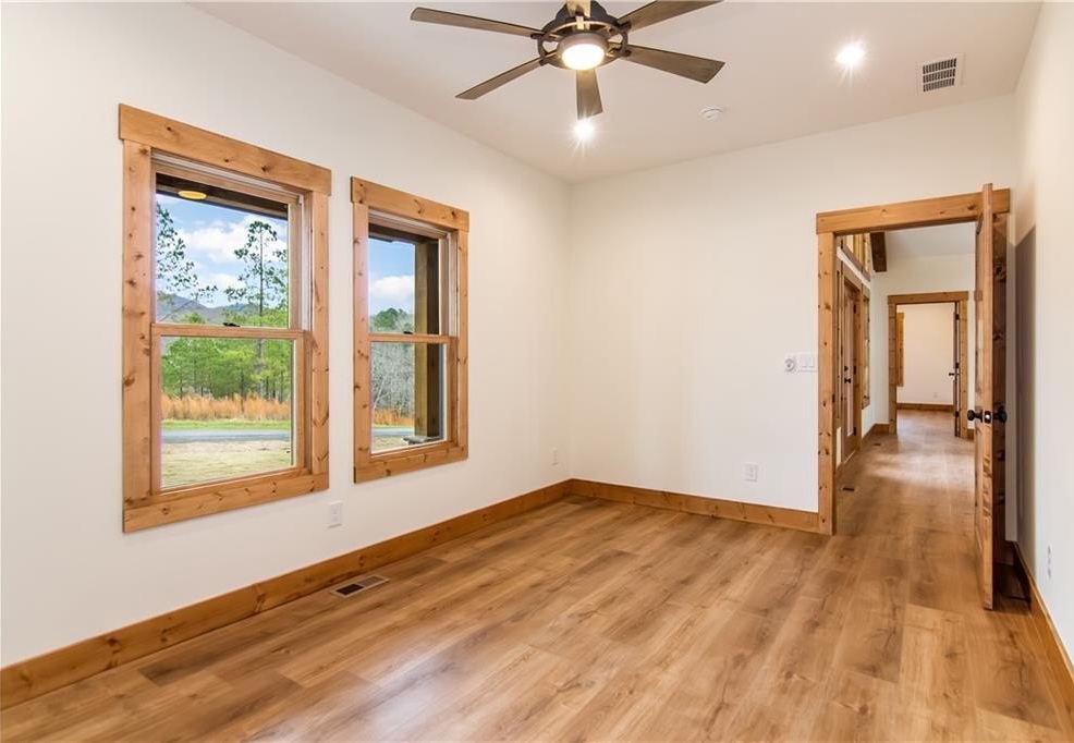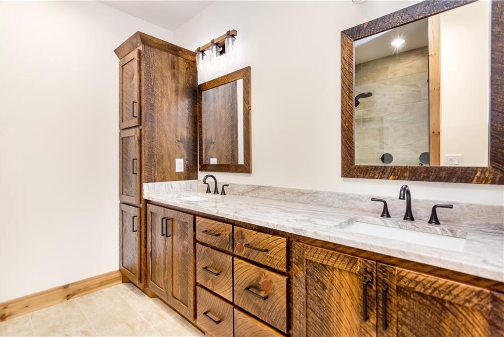 Inside, the main level offers warm wood accents, durable LVP flooring, wood-beamed ceilings, a gas fireplace, and a relaxing covered back porch. The kitchen includes wood cabinetry, quality appliances, a range in the island, touchless faucet, and a huge walk-in pantry. The primary suite features heated floors in both the bedroom and bathroom, a tile shower with dual heads, double vanities, and a Jacuzzi tub. Another bedroom, full bath, office, and the main-level laundry complete this floor.