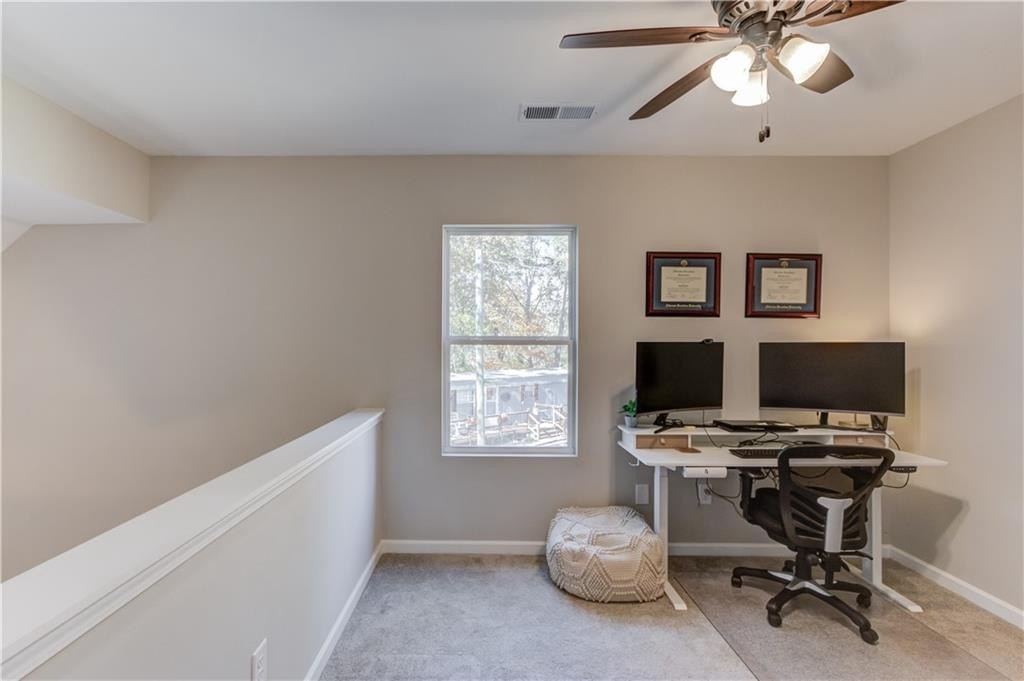 Upstairs, you’ll find two additional bedrooms, a full bath, and an open office/flex space perfect for working from home, a play area, or a cozy lounge setup which can be converted for a fourth bedroom if needed. This two-story home sits on a slab foundation with thoughtful use of space throughout.