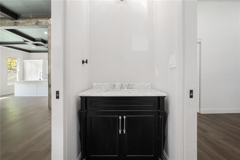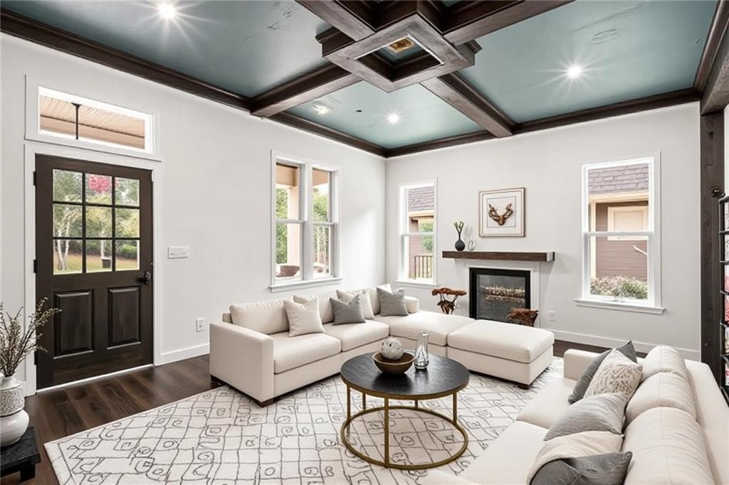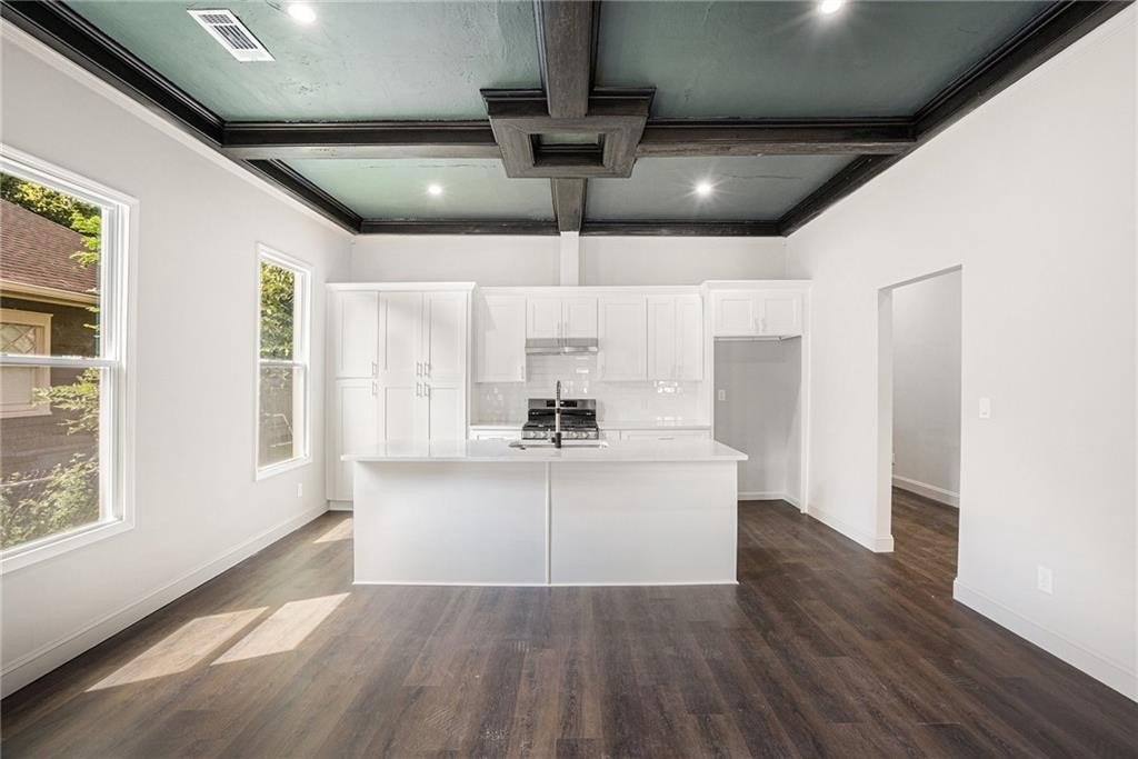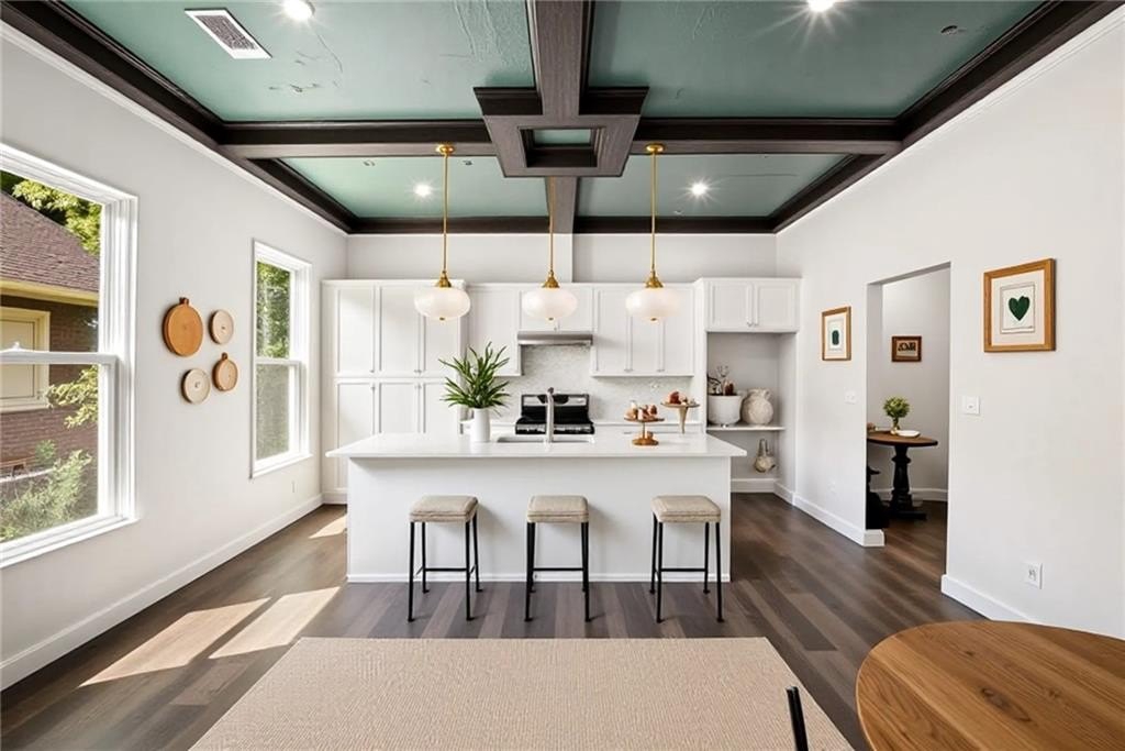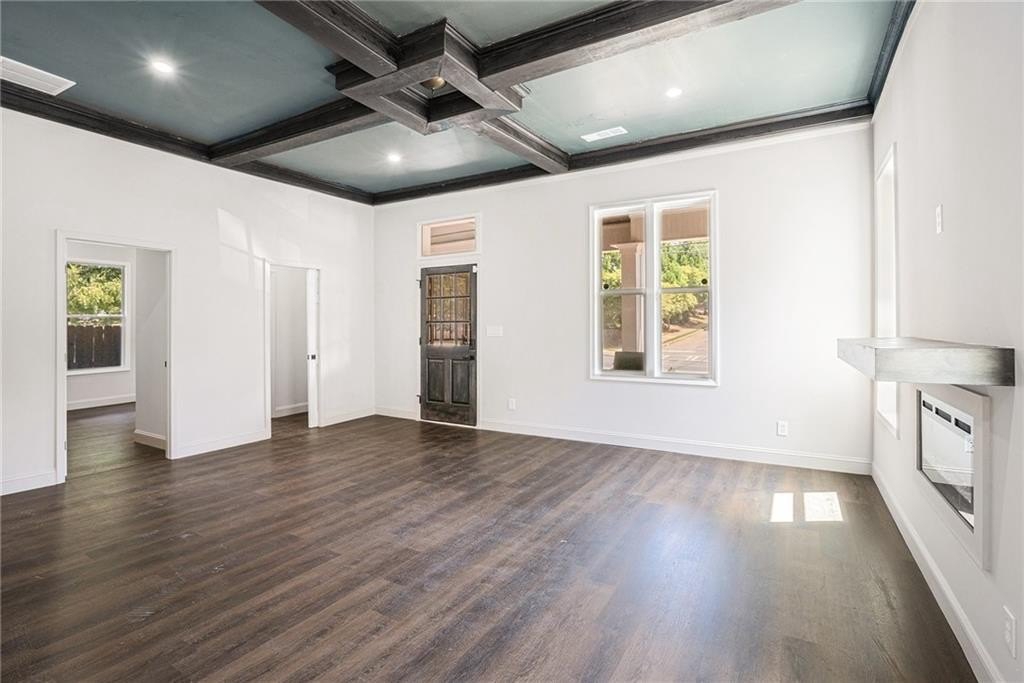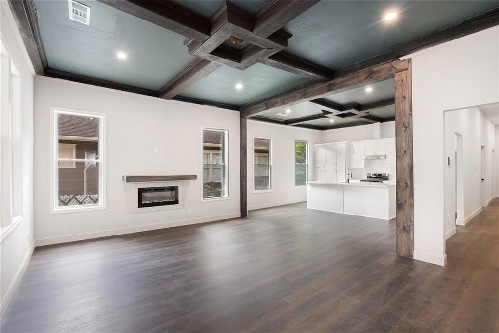 Open floor plan with original architectural ceiling beams. Makes modern living seem timeless.
