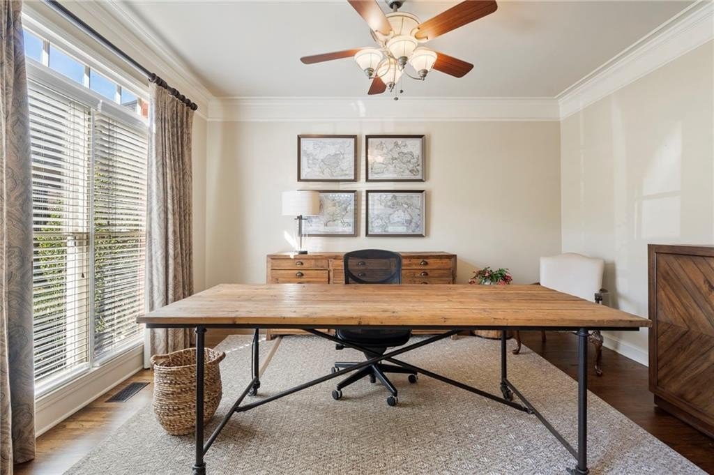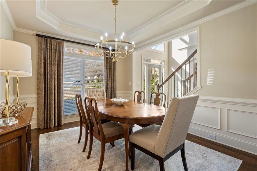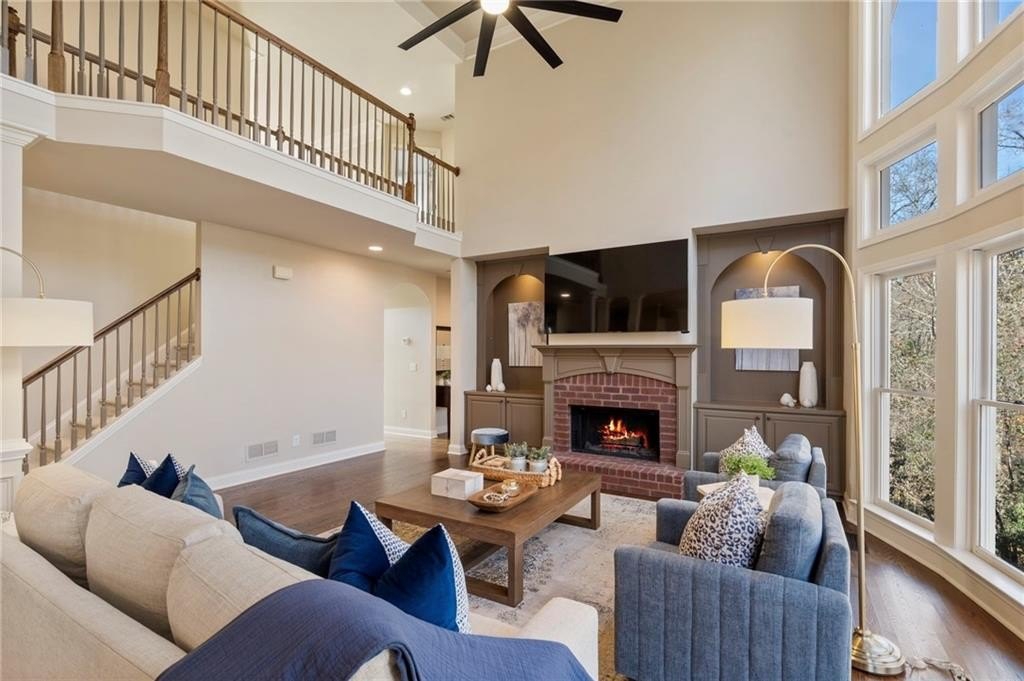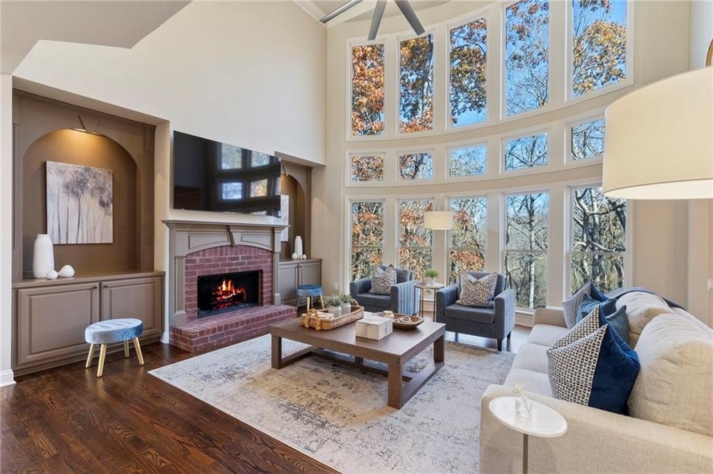 Step inside the gracious two-story foyer, where natural light floods the inviting office and the elegant dining room. The heart of the home is the stunning great room highlighted by coffered ceilings, a warm brick fireplace, and dramatic floor-to-ceiling windows that frame beautiful views of the trees beyond.