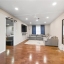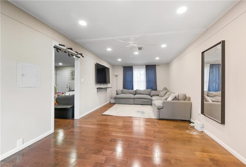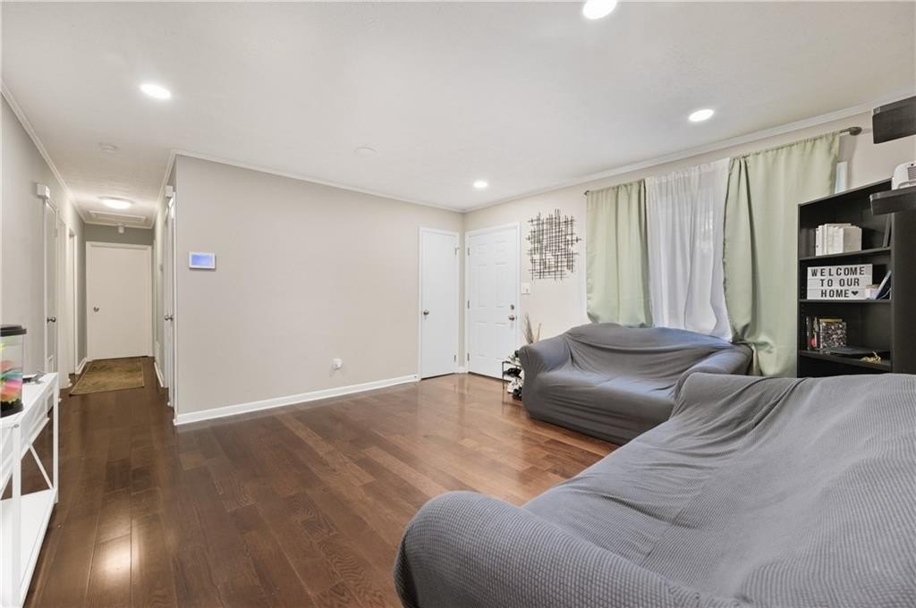 The spacious converted garage creates an extra den/flex space—perfect for a media room, office, or playroom. Recessed lighting throughout brings a warm, modern touch.