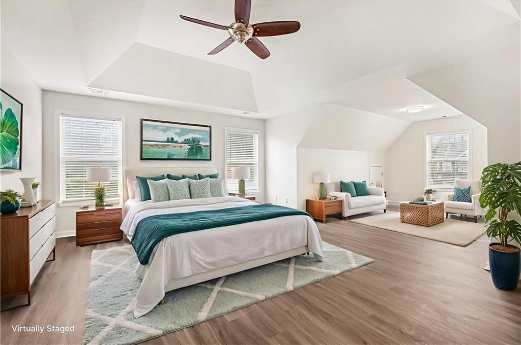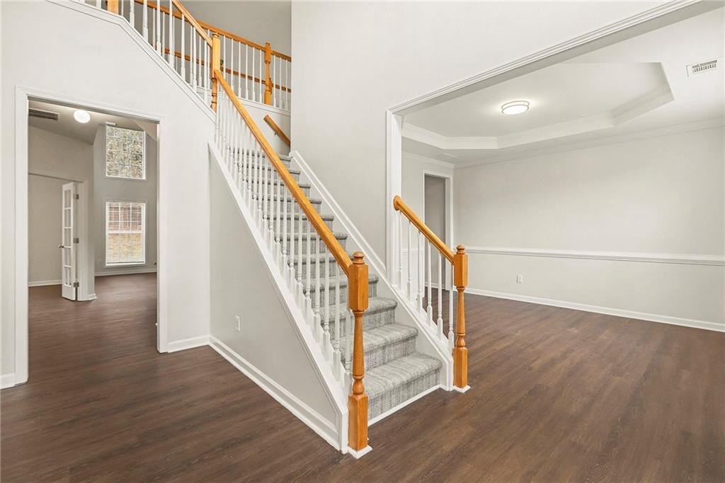 Step through the front door into an impressive two-story foyer, where natural light and an open flow guide you through the home. To your left, a spacious formal living room provides a versatile area for gathering, relaxing, or creating the perfect reading nook. To your right, the elegant formal dining room is ideal for hosting holiday dinners or celebrations, featuring plenty of space for a large table and furniture.
