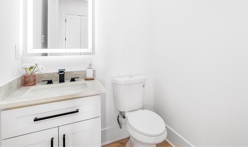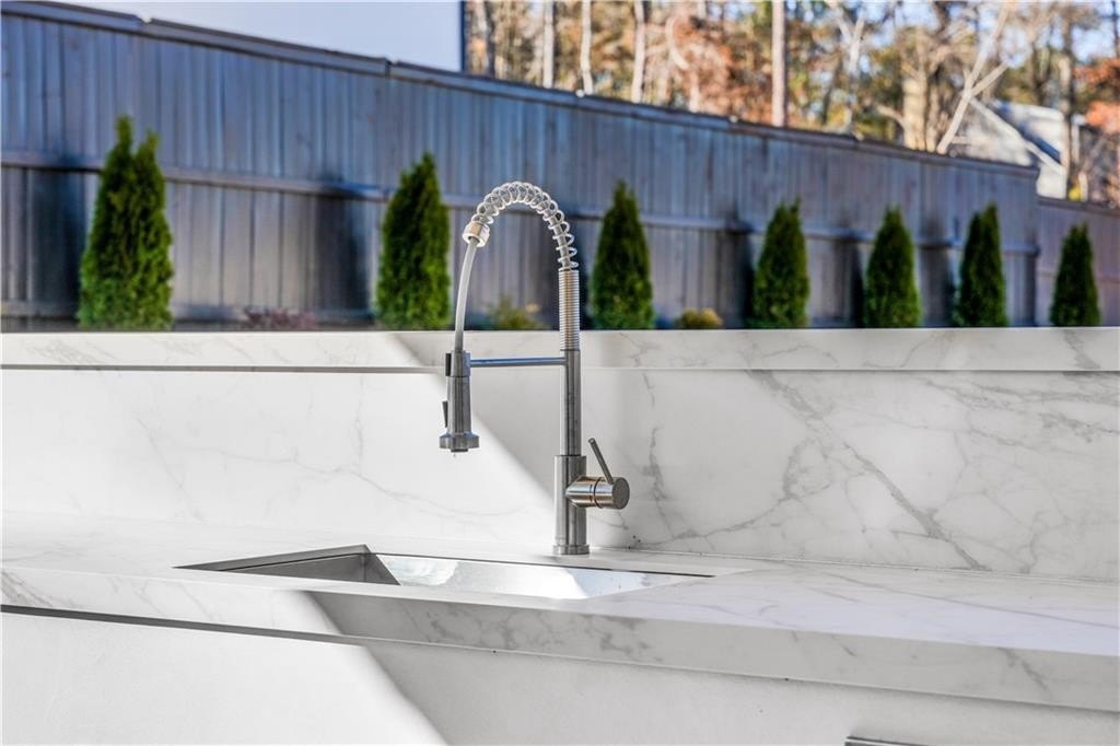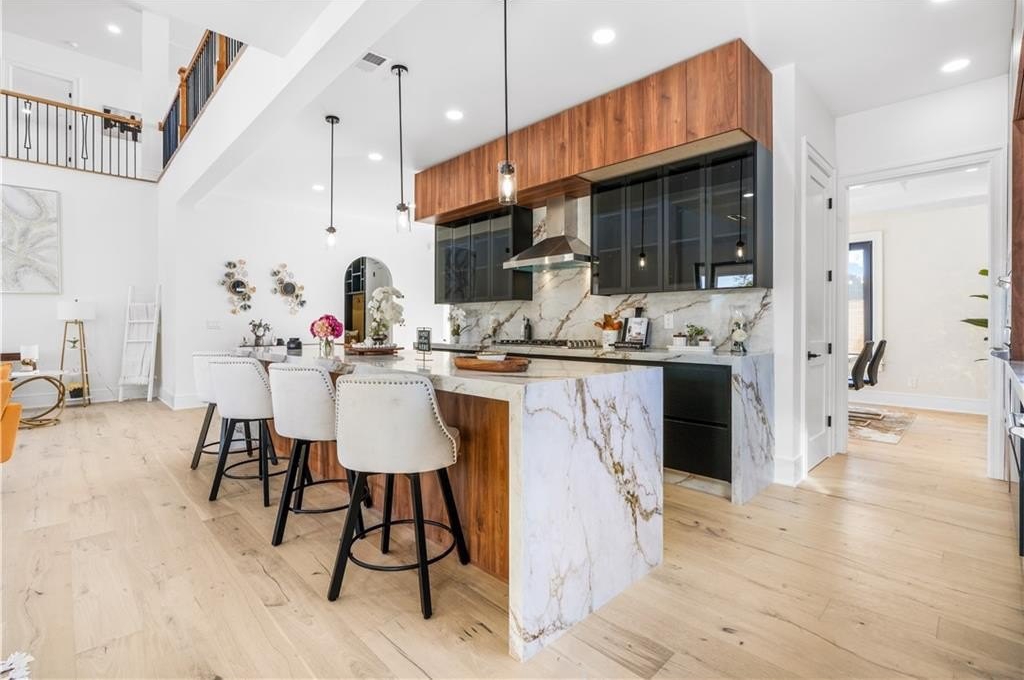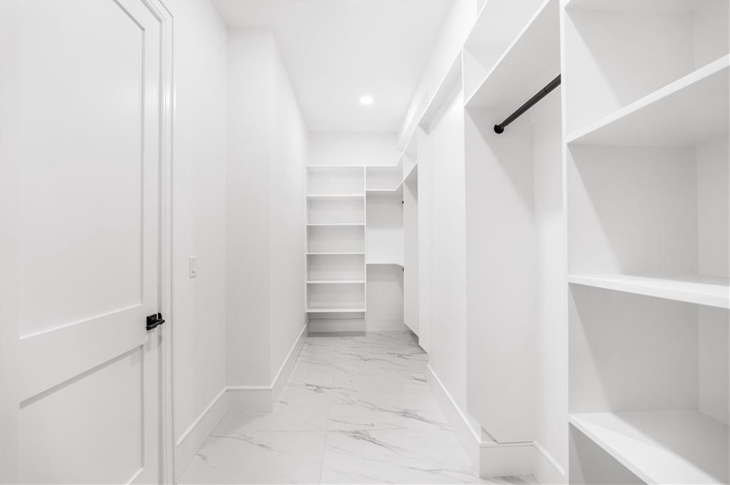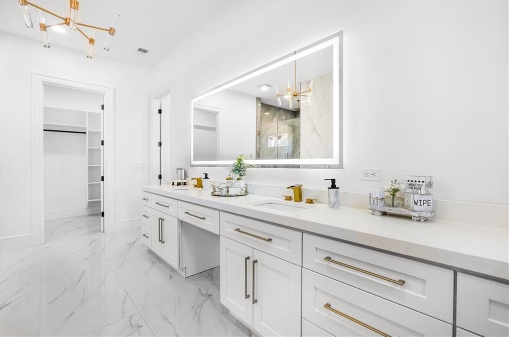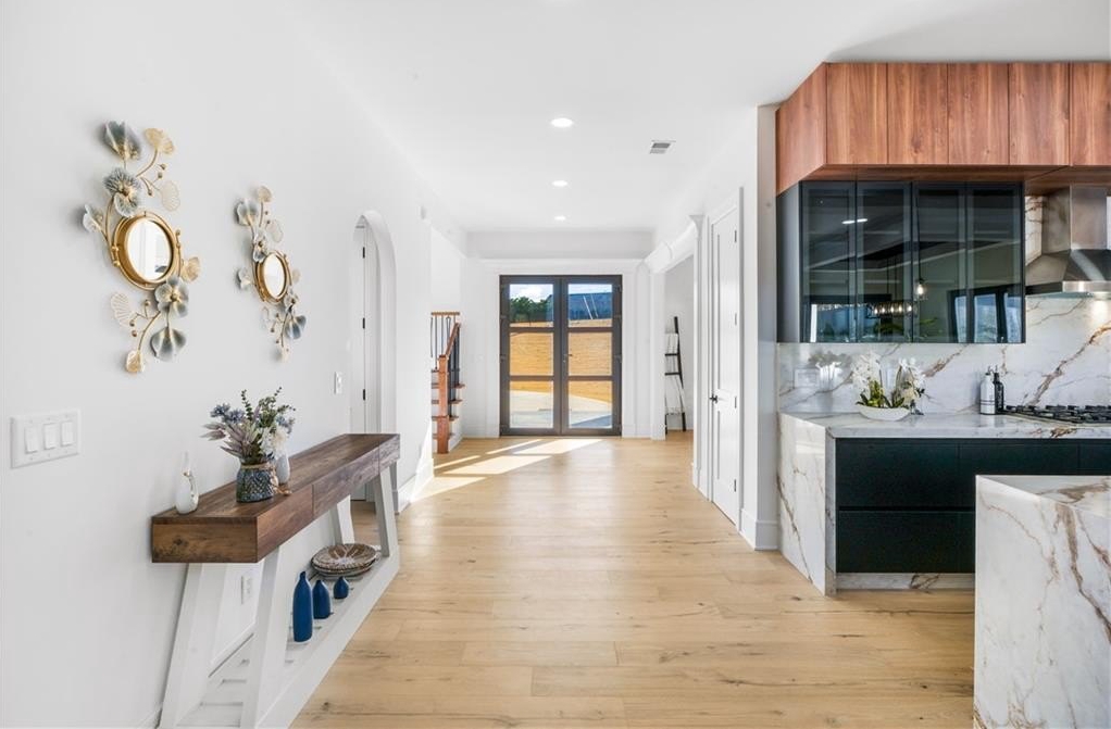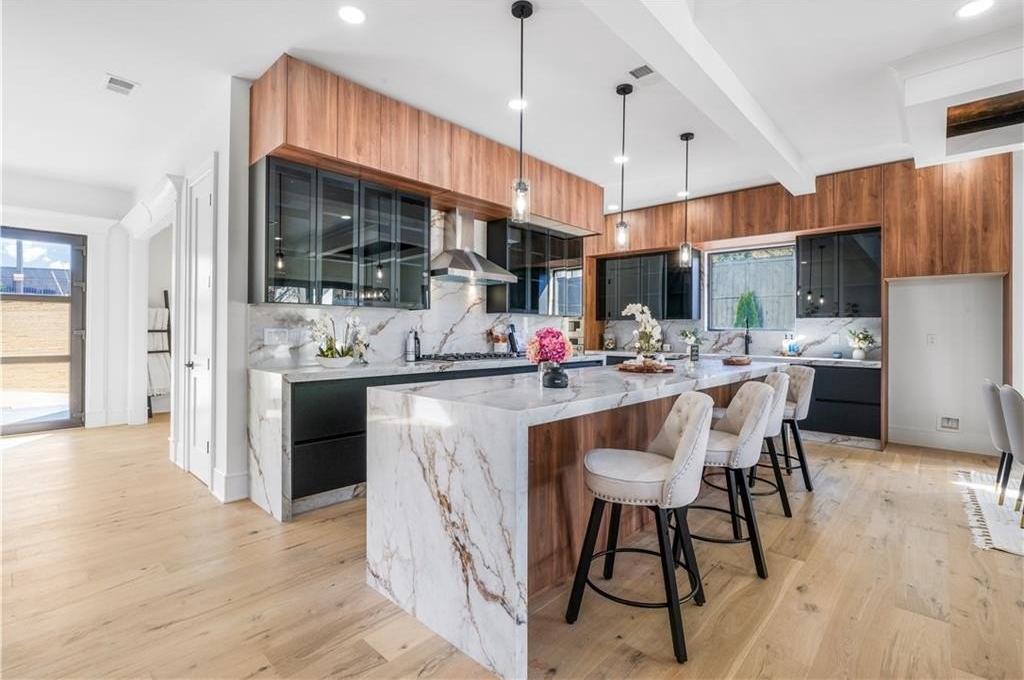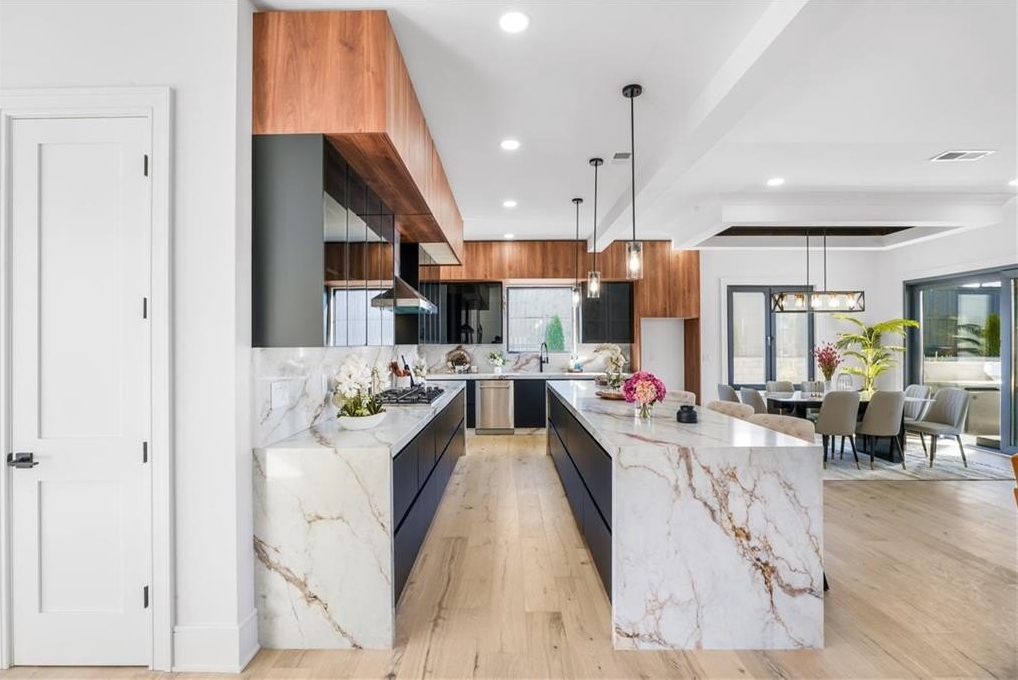interior amenities include HARDWOOD FLOORS throughout, a VENETIAN PLASTER FIREPLACE in main living areas, WHITE OAK staircase, 9-inch baseboards, crown moldings, and a designer EUROPEAN KITCHEN with handleless metal glass cabinetry, custom 3-inch thick DOUBLE WATERFALL COUNTERTOPS, and full backsplashes. european two-way open windows and european sliding glass doors flood the home with natural light and create a seamless indoor-outdoor connection. bathrooms feature TAJ MAHAL COUNTERTOPS. the home also offers DUAL LAUNDRY ROOMS on both levels for maximum convenience.