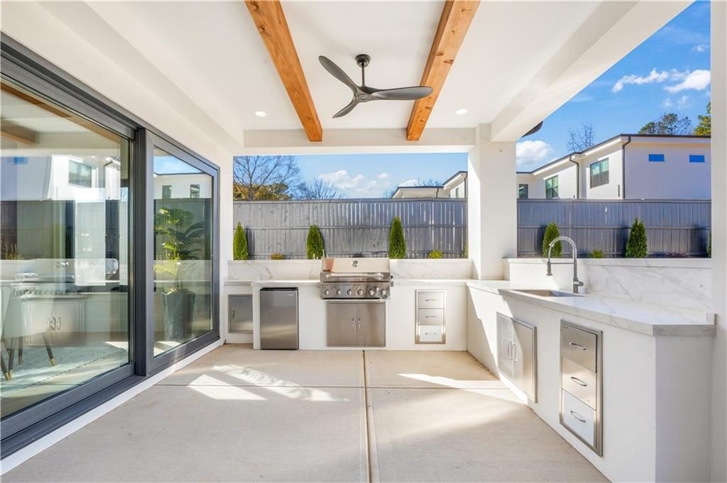 exterior features are designed for entertaining and year-round enjoyment, including stained and sealed WHITE OAK CEILINGS on front and rear patios, a fully equipped OUTDOOR KITCHEN with grill, refrigerator, and sink, DUAL FIREPLACES (indoor and outdoor), custom retaining wall, professionally finished landscaping, FULL SPRINKLER SYSTEM, and a large driveway with capacity for 10+ vehicles.