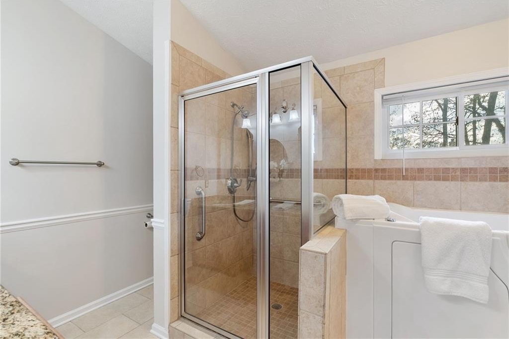 The kitchen, with granite countertops, offers ample cabinet storage, an eat-in area, and convenient laundry access right off the main living space. The primary suite is generously sized and features a WALK-IN CLOSET with DOUBLE VANITIES, and a handicapped-accessible tub.