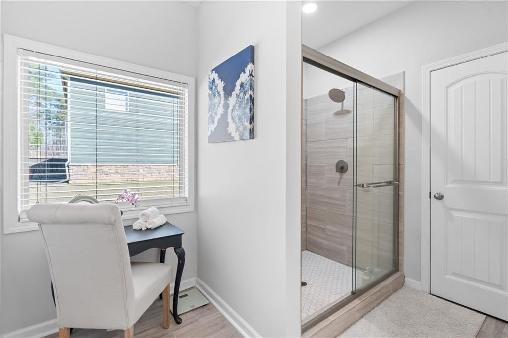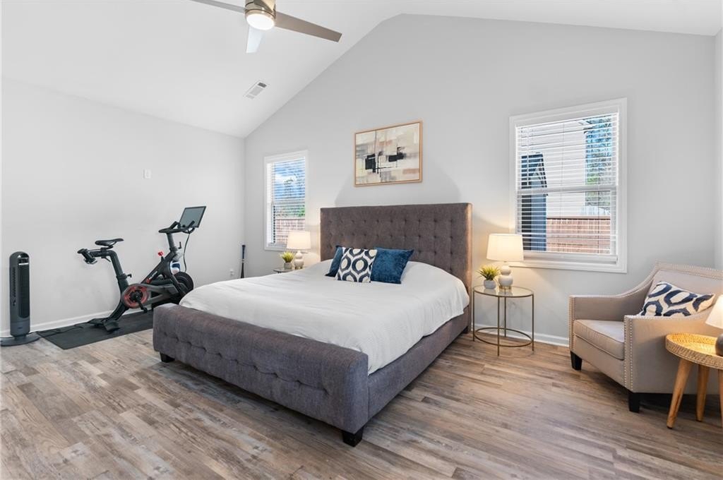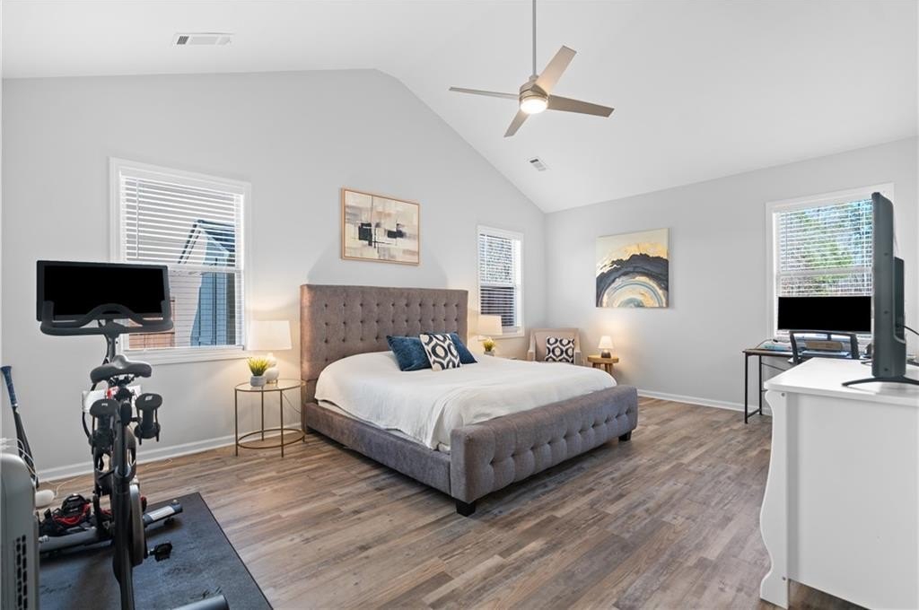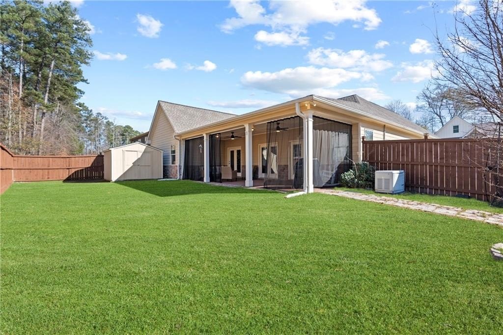 primary bedroom is on the main with huge with cathedral ceilings and lots of natural light, primary bathroom offered a double vanity and newly tiled large shower with a frameless Shower door. Secondary bedrooms are well-sized and offer versatility for guests, home office, or flex space. Step outside to a private fenced in backyard which features a large back porch that spans the entire back of house along with a shed for additional storage—great for entertaining, grilling, or unwinding after a long day. It also includes a whole Home Generator for emergency needs.