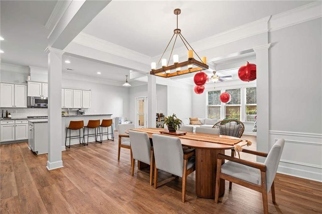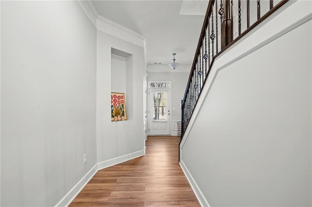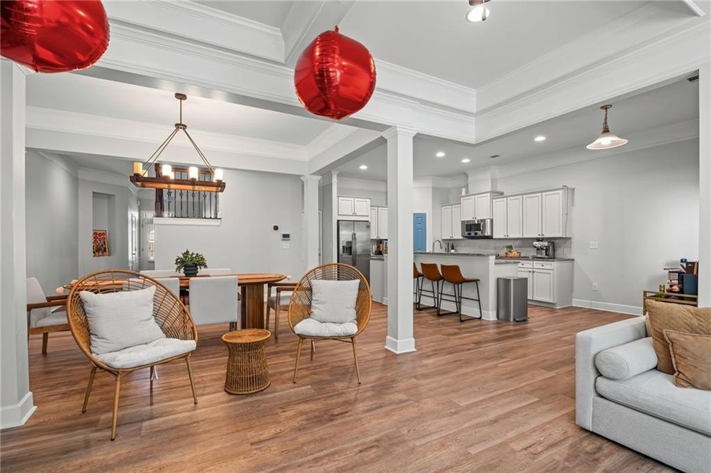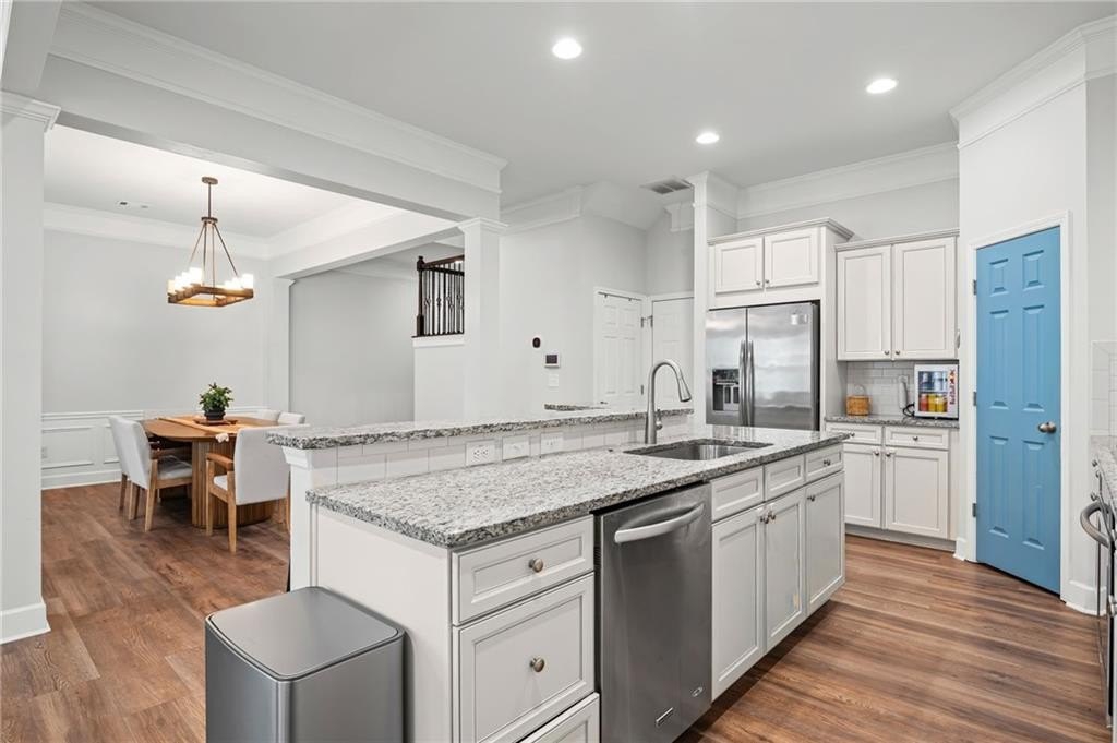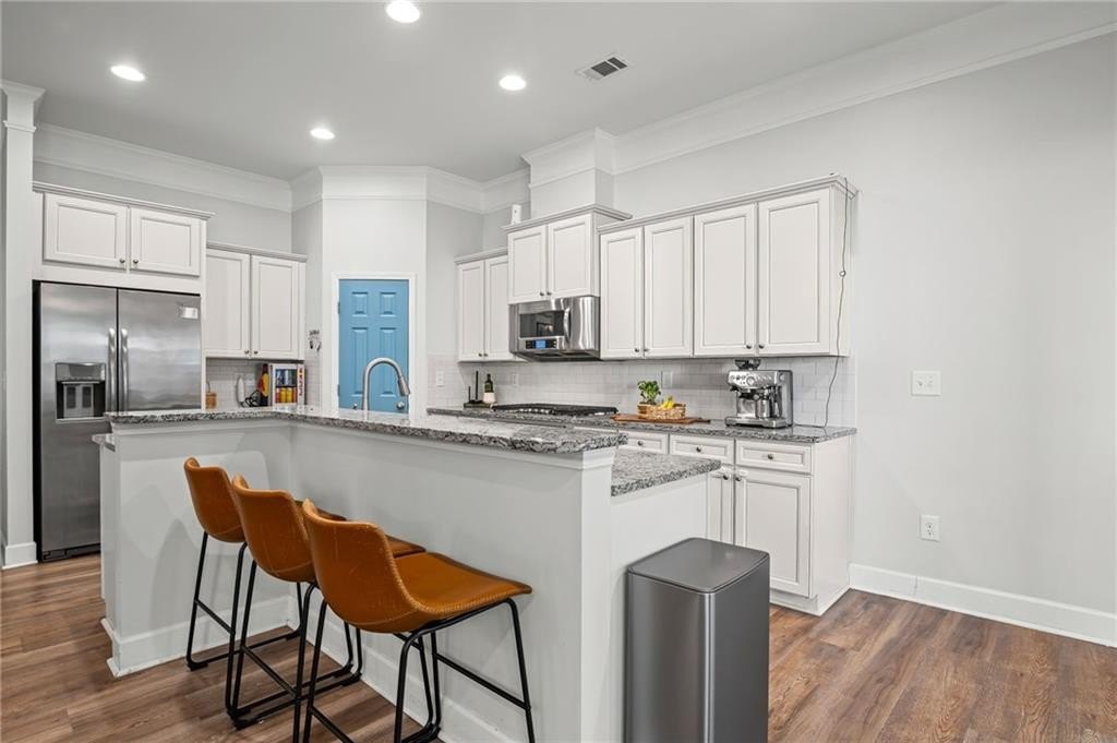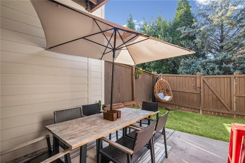 A FANTASTIC WAY TO START THE NEW YEAR IN A STUNNING, MOVE-IN-READY TOWNHOME IN A HOT SMYRNA LOCATION! This beautiful home offers so much, and it is the perfect floor plan! Main level offers luxury vinyl flooring, high-end Kitchen-Aid stainless steel appliances, 1/2 bathroom, an open floor plan, 3-inch blinds, lots of crown moulding, a dining room, an eat-in, and a large living area! When you walk in, you will immediately be greeted with a welcoming 2-story foyer and a hall that leads into your open living space! The large dining room is separated and has an updated chandelier, the open kitchen offers granite, tile backsplash, a large stainless sink with disposal, tons of cabinets space, walk in pantry, gas 5 burner stove top, breakfast bar, island and eat in kitchen that leads to your back covered patio perfect for entertaining or a quiet place for your morning coffee! The backyard is fenced in and private. The living area offers lots of natural light and a gorgeous stacked stone fireplace complete with coffered ceilings! Walk upstairs and you will find your oversized master bedroom complete with a separate sitting area and a private balcony! The master suite offers 2 separate vanities, his and hers walk in closets, garden tub and separate shower with tile surround! The other 2 bedrooms are on the opposite side and each offer their own separate full bathroom! The secondary bedrooms are very large and offer walk in closets in each room. This home has lots of storage space and a laundry room with plenty of shelving for your storage needs! Sought after Vinings Crest community with gated entrance! Superior location off Paces Ferry Road with quick access to I-285, I-75, and Atlanta Airport. Just minutes from The Battery, Vinings Jubilee, and major corporate hubs like Home Depot. Lots of dining and shopping nearby! The HOA takes care of the essentials, including water, sewer, trash, exterior maintenance, landscaping, and termite control, ensuring low-maintenance living so you can focus on what matters most!