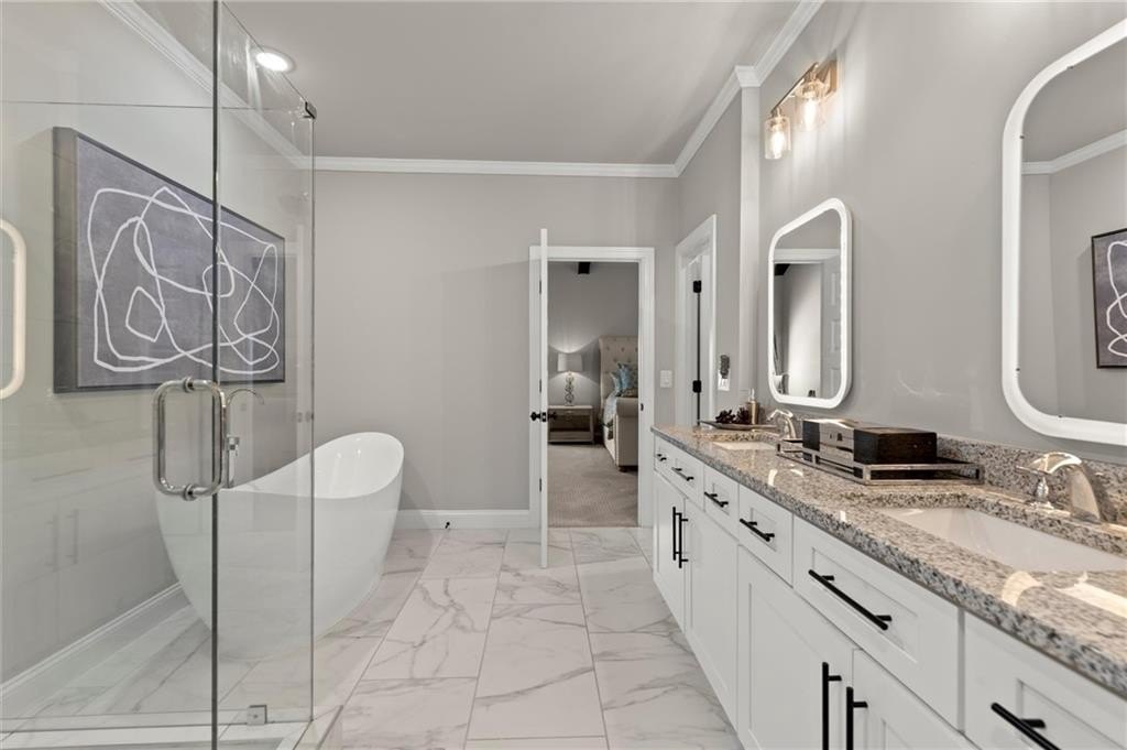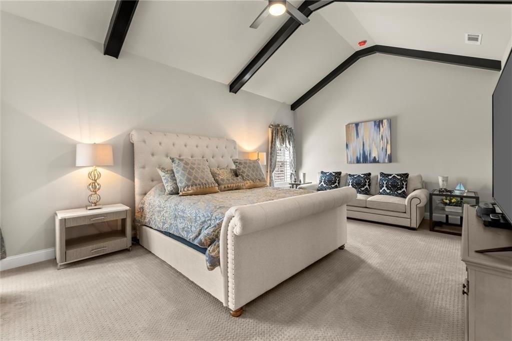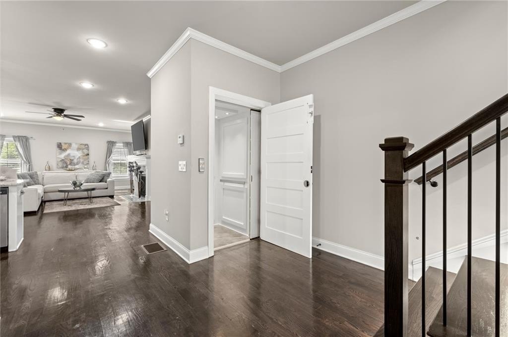 Welcome home to your private luxury townhome set within an exclusive, gated enclave of all-brick and stone residences. With a beautifully landscaped courtyard, additional guest parking, and secure entry, this community delivers sophistication and privacy from the moment you arrive. Step through the front door into a striking foyer featuring LED-lit staircases and a private elevator offering seamless access to all three levels. The main floor showcases a formal dining room, a gourmet kitchen with gas cooking and quartz countertops, and an inviting living room filled with natural light. Just beyond the living area is an enclosed sunroom with a Juliette balcony, and above it, clerestory windows channel soft sunlight into the living room, creating a bright, airy environment without the heat of direct sun. This home offers 3 oversized bedrooms, each with a full en-suite bathroom featuring upgraded tile and modern finishes. The upper-level primary suite boasts vaulted, beamed ceilings, generous closet space, and a spa-like bathroom with a freestanding soaking tub and frameless glass shower. The terrace level includes another large suite-ideal as a second primary-and provides access to the upgraded epoxy-coated garage with an interior storage room. With upgraded lighting throughout, energy-efficient LED fixtures, and timeless luxury design, this home blends comfort, elegance, and effortless living.
