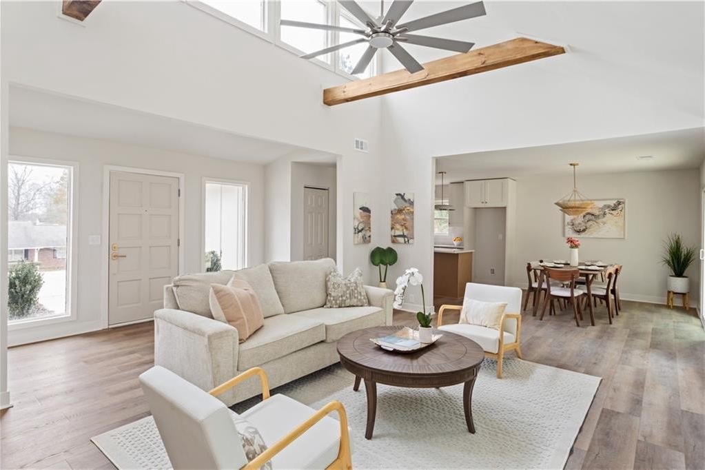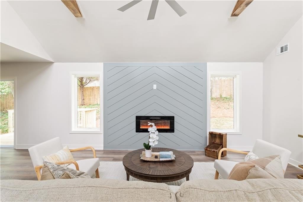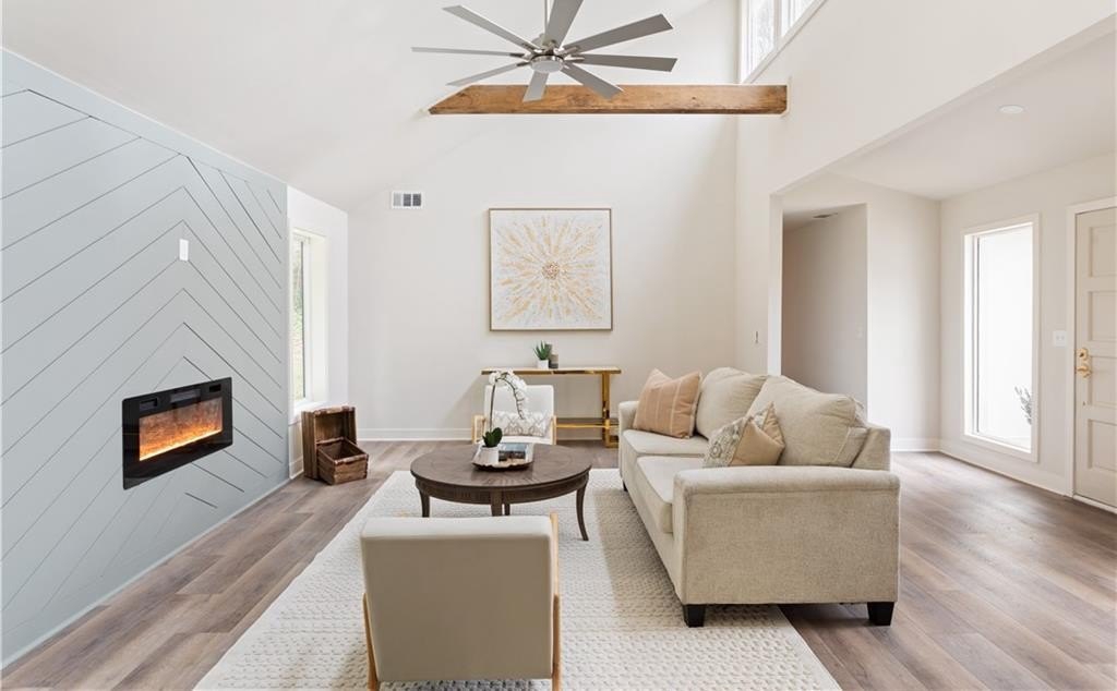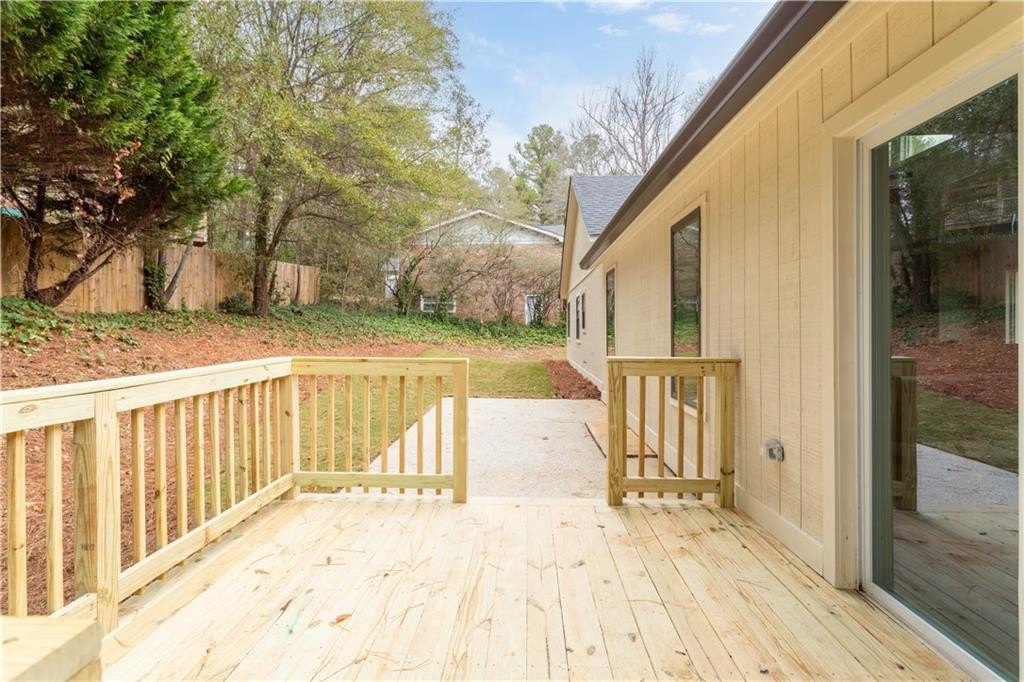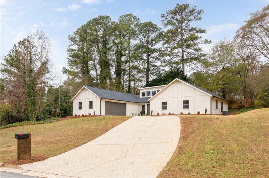 A rare, completely-renovated, modern farmhouse styled ranch with natural light, privacy, and timeless details just minutes to the Silver Comet Trail, Smyrna, and Vinings. Sitting on a private corner cul-de-sac lot, the exterior features a soft cream color with bronze accents, natural wood peaks, a new roof and board-and-batten siding. Step inside this 3-bedroom, 2-bath ranch through the oversized 2-car garage, that leads into a custom mudroom - something you won’t find in most homes. A must see! The kitchen is finished with Taj Mahal quartz, a spacious island, brand new appliances and a view of clerestory windows that brighten the living room. High ceilings and an electric fireplace anchor the main living space along with large picture windows with views into your back yard. Step into your primary suite, a spacious bedroom with natural light and luxury finishes. Checkerboard tile, natural wood cabinets, an 8-foot walk-in shower, a double vanity with an additional pantry for storage, and a sizeable walk in closet. The two secondary bedrooms are well sized with ample-closet space. Every paint color, fixture, and finish has been thoughtfully selected to create a warm and welcoming living experience. Outside, a new deck overlooks the backyard with plenty of privacy and space for entertainment, with the opportunity to expand the yard space with just minimal effort!