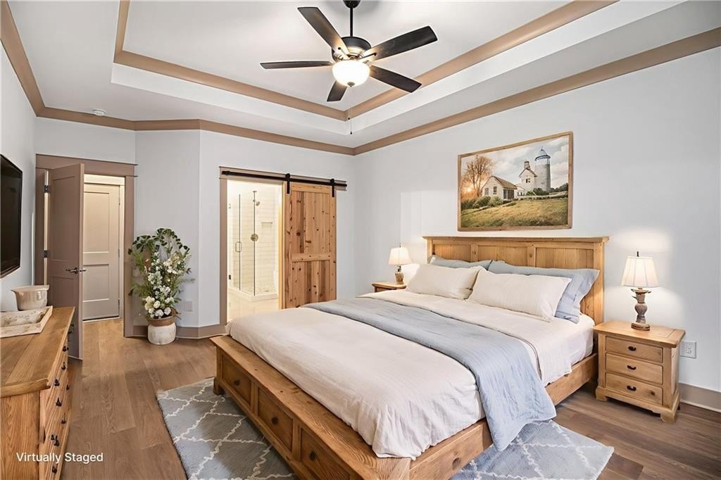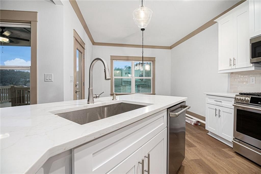 At the heart of the home, the gourmet kitchen impresses with white cabinetry, stainless steel appliances, and granite countertops, making meal prep a joy and entertaining effortless. The spacious primary suite on the main level offers a relaxing escape, accompanied by two additional bedrooms for convenience.