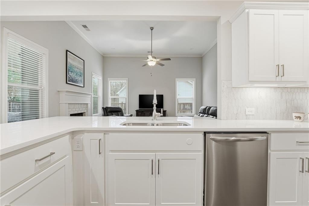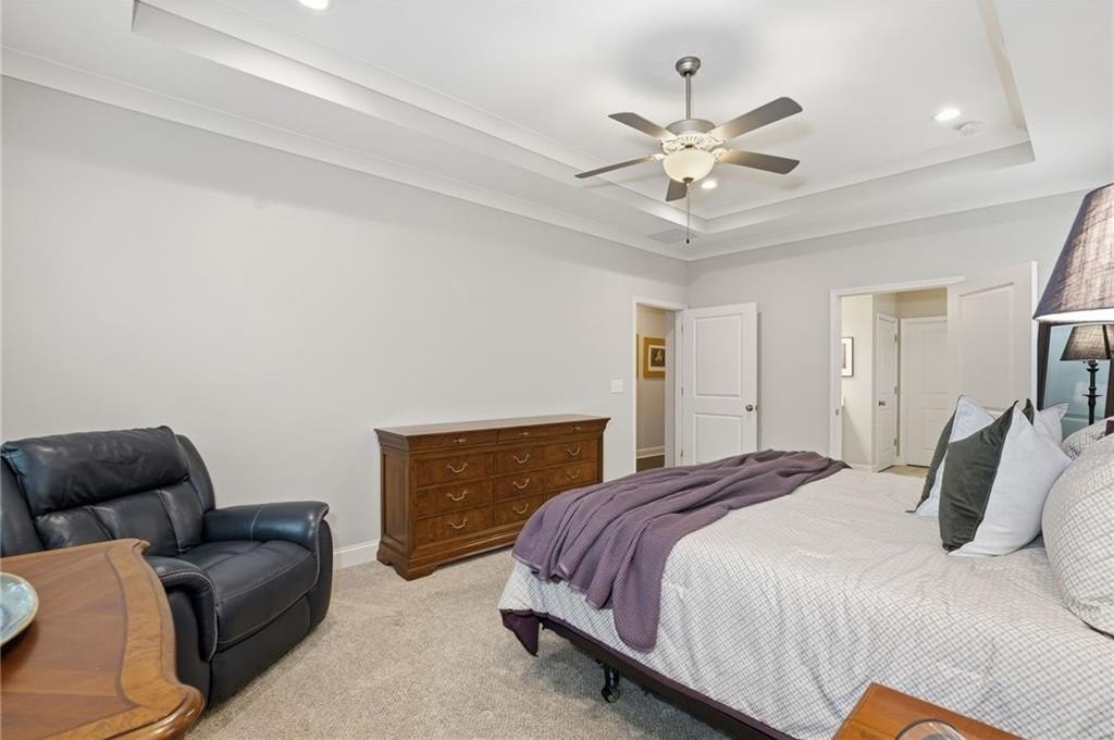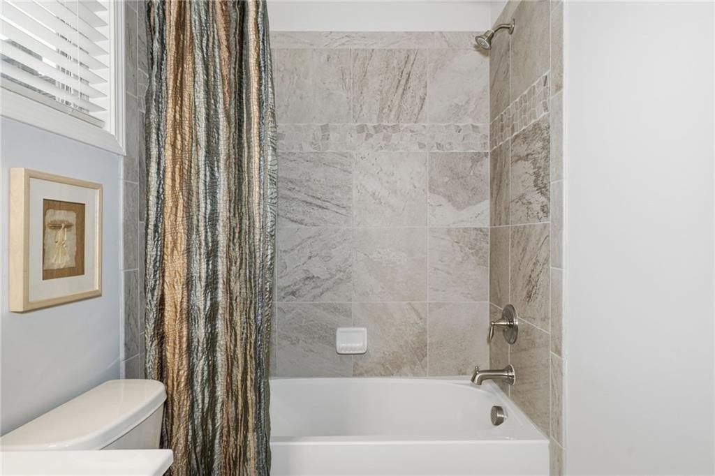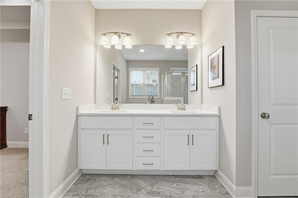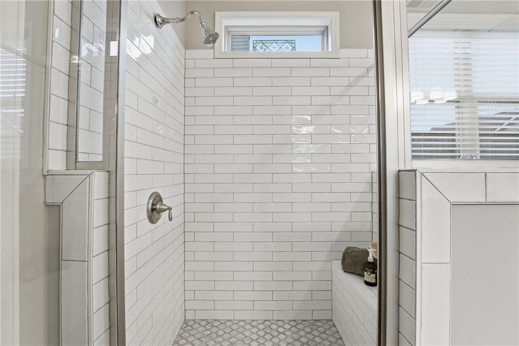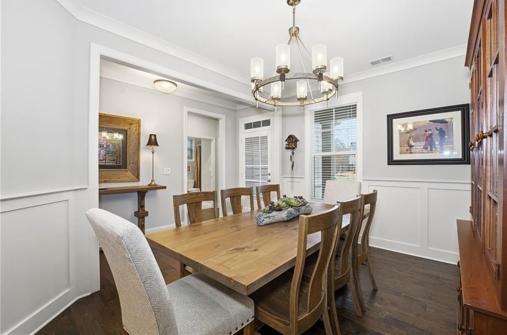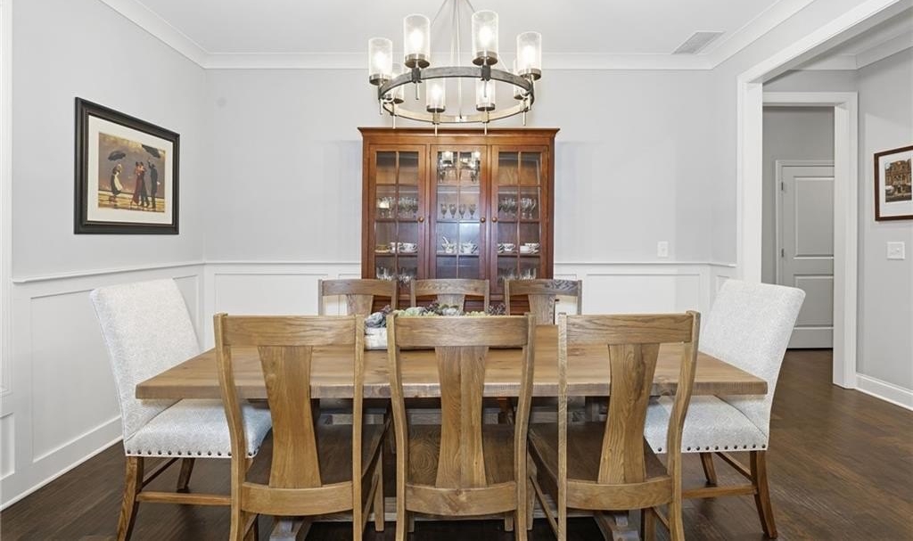 The gourmet kitchen features stainless steel appliances, quartz countertops, a designer backsplash, under-cabinet lighting, and a large island overlooking the family room and breakfast area. A formal dining room adds extra space for entertaining. The main-level primary suite includes a walk-in shower with bench, soaking tub, double vanities, and a spacious walk-in closet. Two additional main-level bedrooms share a full bath, while the upstairs bedroom with private bath is ideal for guests. A large walk-in attic offers excellent storage or potential for expansion.