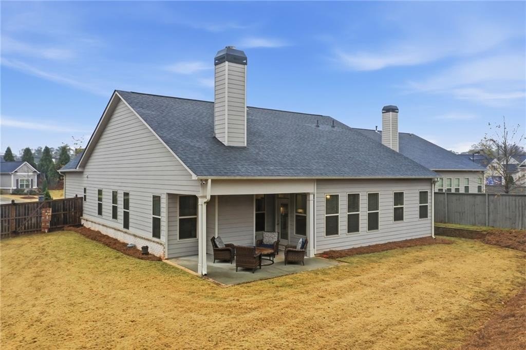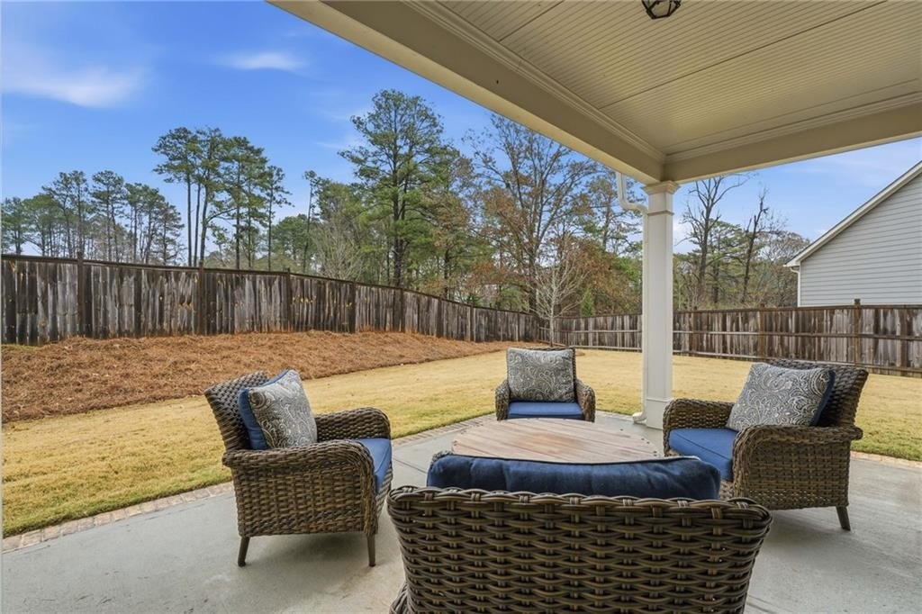 Enjoy outdoor living on the covered front porch or the covered back patio with extended grilling area. The fenced backyard backs up to peaceful wooded views and sits on one of the largest, most private lots in the community.